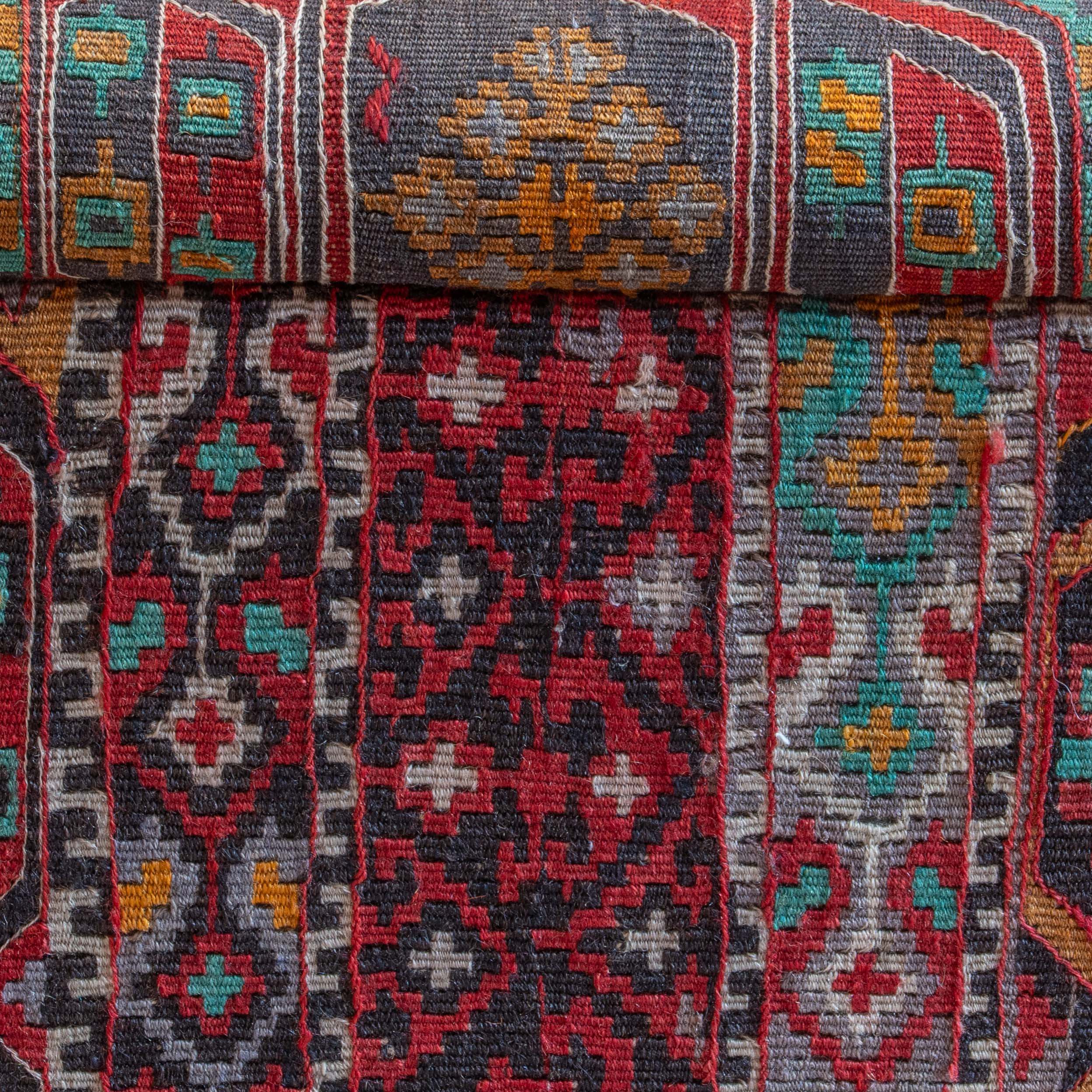 Salvaged Kilim rugs are often used to produce these pieces, particularly old Turkish Kilim rugs, which often feature intricate motifs with symbolic meanings. Vegetable-dyed wool is a beautiful natural fibre that generally contains high levels of lanolin, making it very practical. Kelim is woven using hand-dyed wool in both the warp and the weft. The patterns produced are often identified by the region in which they are made, and the designs are passed down through generations from mother to daughter.
