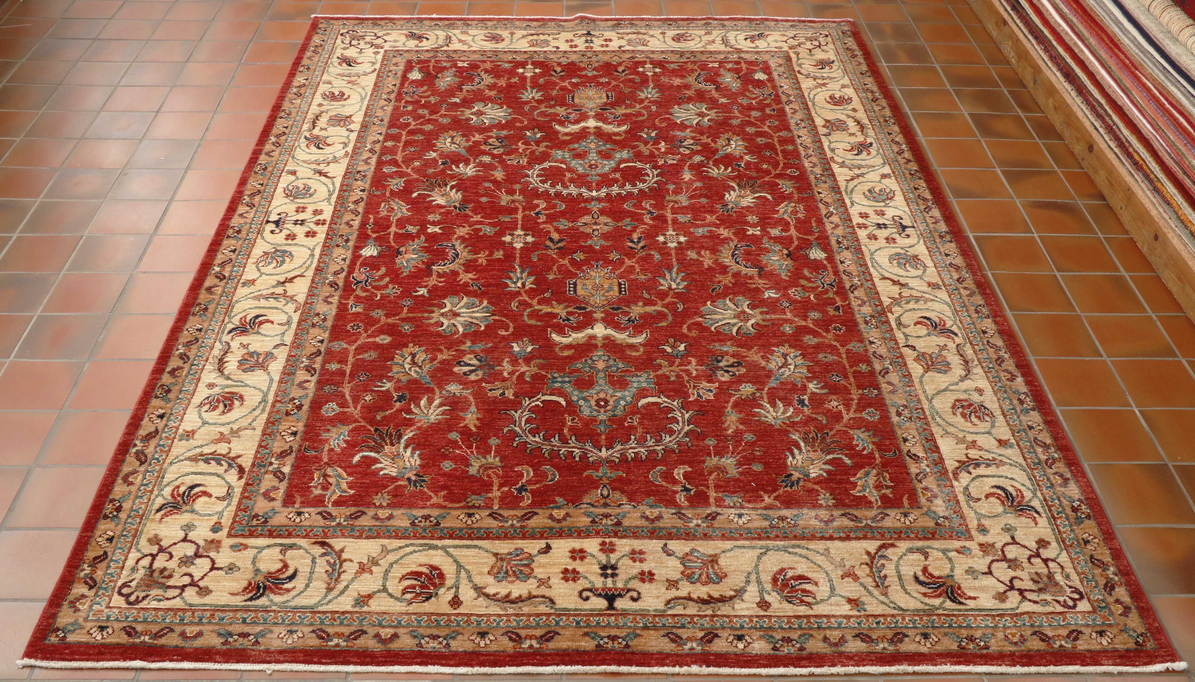 The tomato-red background and the cream border make this quite a light-coloured rug overall, but it has a rich warmth from the red. The classic pattern is pleasing to the eye, with its simple curvilinear border design. This rug has been made in superb quality; it is practical and suitable for any room in the home.