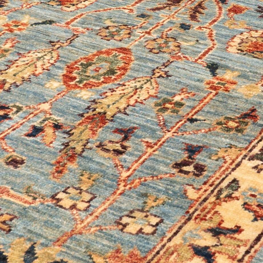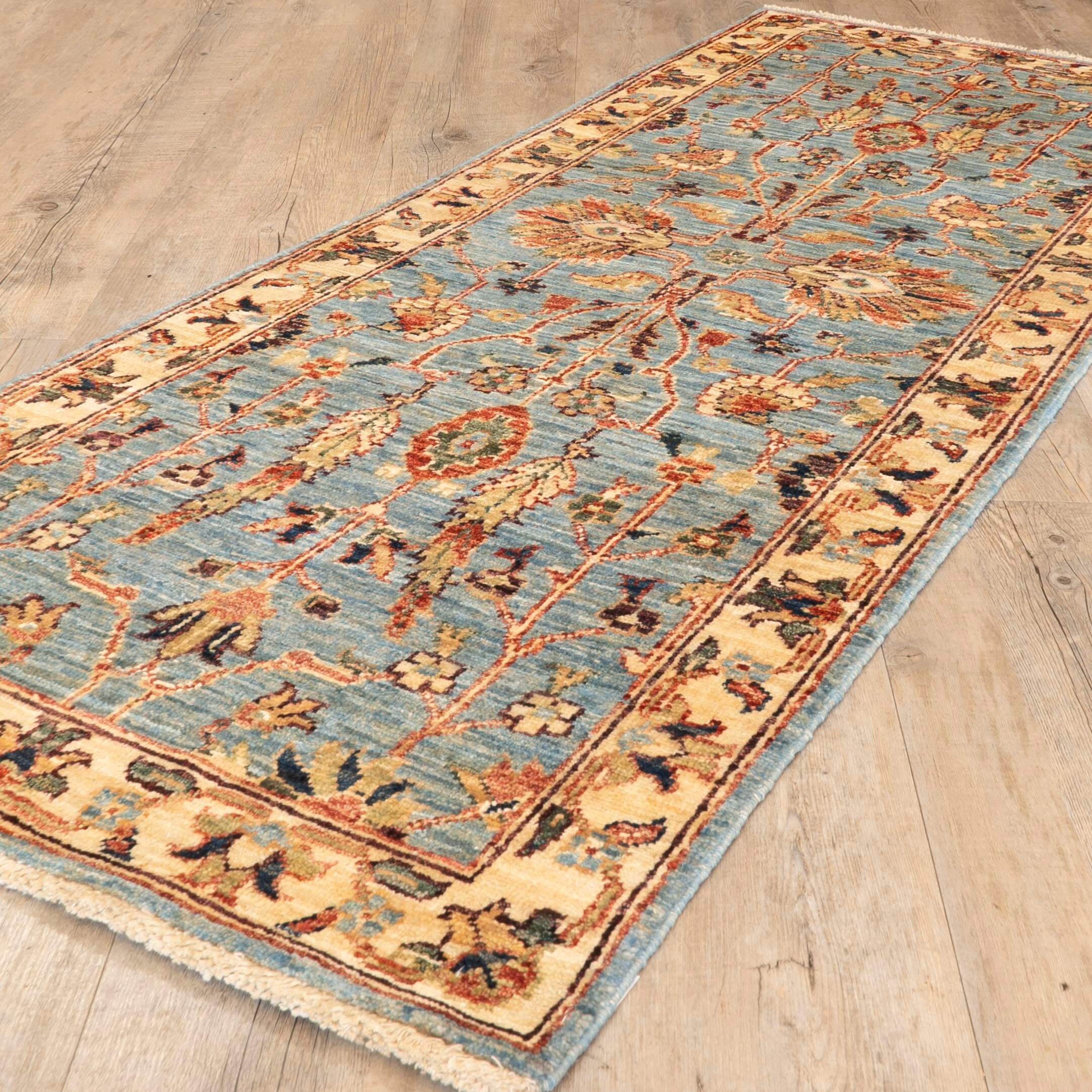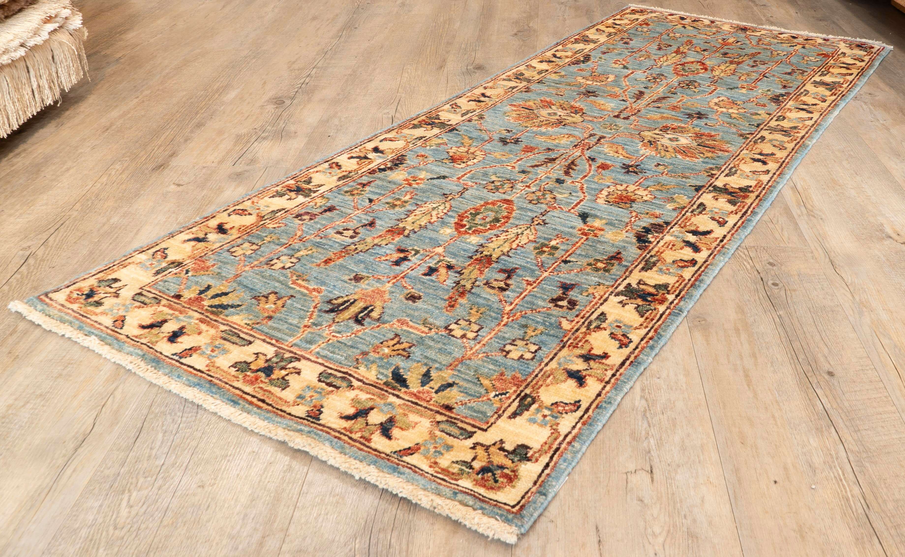 Enhance your living space with this distinctive handmade Afghan Choeb Rang runner rug, featuring a traditional design that adds character and charm. The harmonious blend of gold and blue offers subtlety and vibrancy, while the durable wool construction ensures lasting quality. Elevate your décor with a piece that combines artistic uniqueness and enduring craftsmanship, moving beyond the ordinary to bring a sophisticated touch to your home.Please click the hyperlinks in gold if you are interested in additional information.This unique and varied collection is produced in northwest Afghanistan and has a construction similar to that of the Ziegler rugs. The wool is...