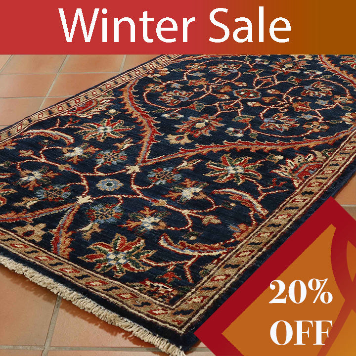 This striking Afghan runner features a classic oriental design, showcased to its best advantage on the dark blue background. A runner like this is useful on a landing or at the foot of the bed. It is a useful size, of excellent quality, practical and hardwearing, suitable for any room in the home. Please click the hyperlinks in gold if you are interested in additional information.This unique and varied collection is produced in northwest Afghanistan and has a similar construction to the Ziegler rugs. The wool is hand-sheared from indigenous Karukal sheep. It is then hand-spun and coloured using natural vegetable and mineral...