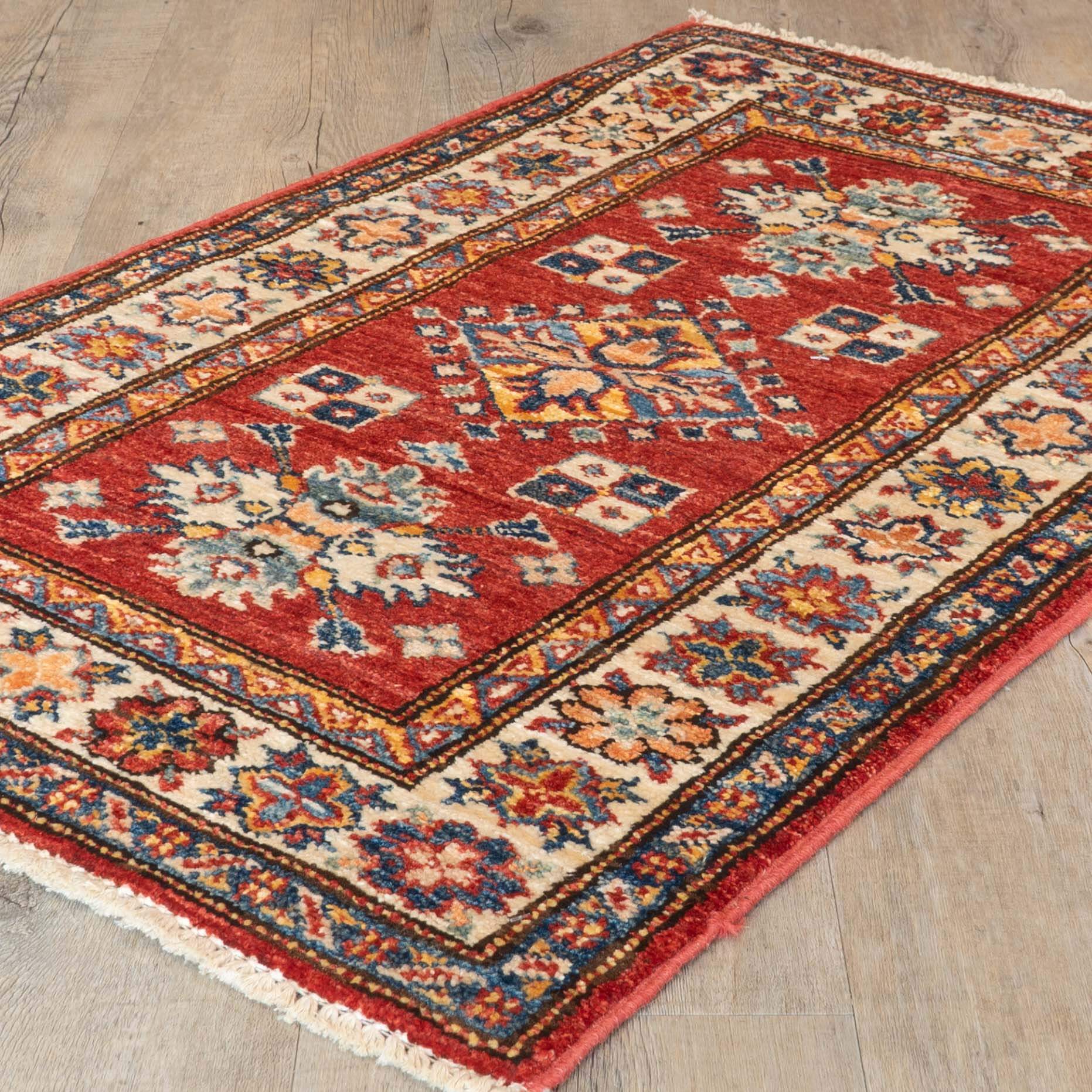 This handcrafted Afghan Kazak rug is the perfect addition to any room. Made by skilled artisans in Northwest Afghanistan, this item is crafted from vegetable-dyed, hand-spun wool and features a timeless, geometric pattern for a unique touch. Featuring a traditional craft of the cottage industry, this rug is sure to bring a colourful cultural flair to your home.  Please click the hyperlinks below in gold for additional information.  Although Kazaks are hand-knotted in Afghanistan, the design originates from the Caucasus. The short pile emphasises the sharpness of the pattern. Each piece is crafted from exceptional Afghan wool, typically spun in Ghazni....