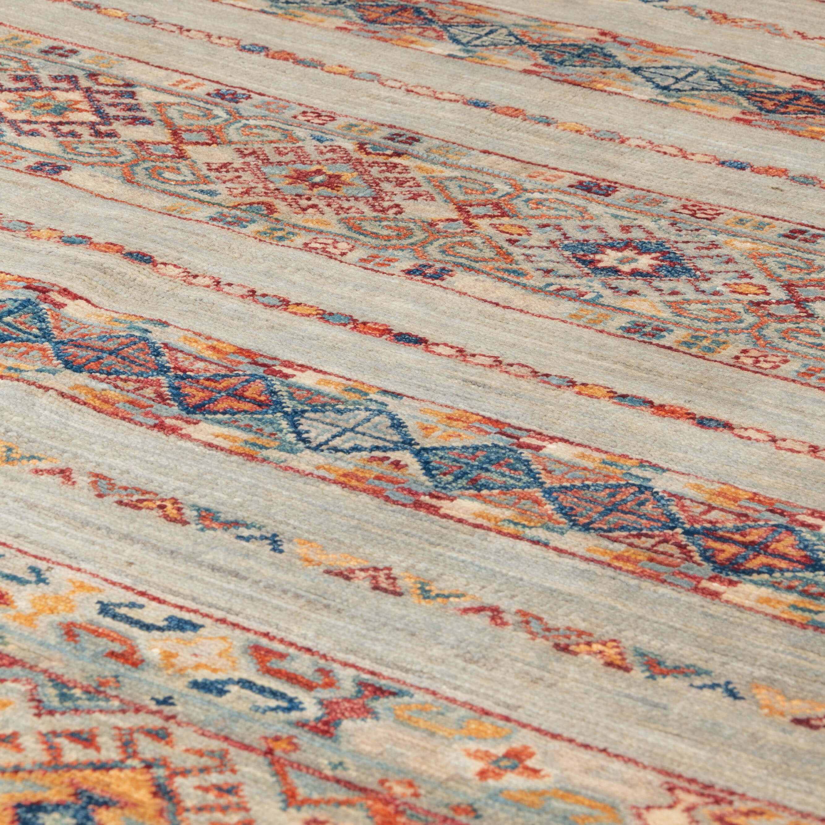 Kharjeen (Khorjin) rugs, runners and carpets are still hand-knotted, and the wool is coloured with vegetable dye. The Kharjeen (also known as Khurjeen) rug designs can be reminiscent of those found in Gabbeh designs. The colours of the Kharjeen rugs and carpets are similar in many ways to those used in our Samarkand and Loribaft collections. Some Kharjeen pieces do not have fringes and are finished with a plain kilim end or binding secured to prevent fraying. The other rugs are generally produced like the Samarkand carpets with an unusual bobbin wind on the warps.
