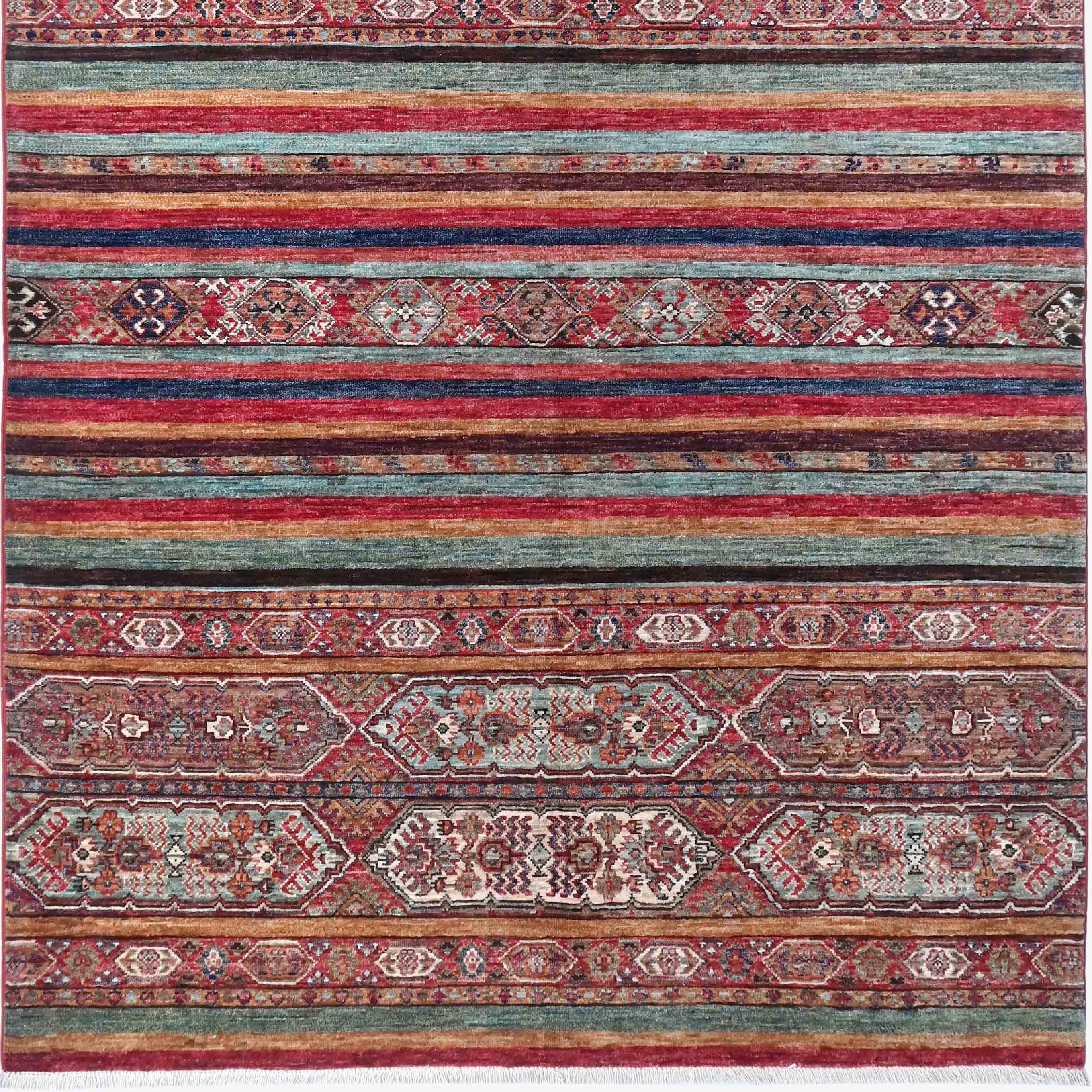 Kharjeen (Khorjin) rugs, runners and carpets are still hand-knotted, and the wool is coloured with vegetable dye. The Kharjeen (also known as Khurjeen) rug designs can be reminiscent of Gabbeh designs. The colours of the Kharjeen rugs and carpets are similar in many ways to those used in our Samarkand and Loribaft collections. Some Kharjeen pieces do not have fringes and are finished with a plain kilim end or binding secured to prevent fraying. The other rugs are generally produced like the Samarkand carpets with an unusual bobbin wind on the warps.