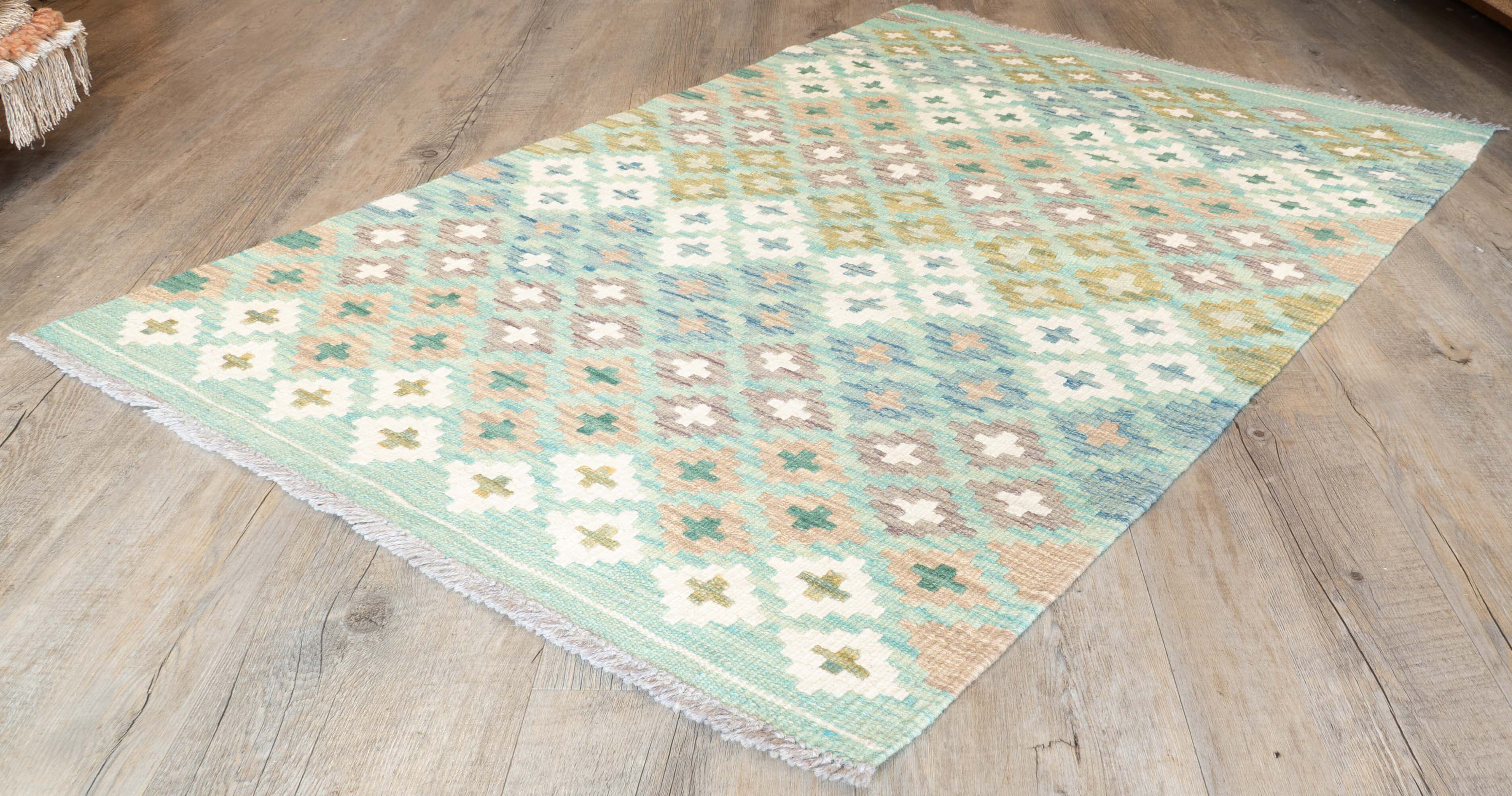 Experience the quality and tradition of Afghan craftsmanship with our handmade Kilim in pale green colourings. This flat-weave kilim is woven from traditional, vegetable-dyed wool, making it durable and ideal for use with underfloor heating. Its colourful and striking design is reversible, allowing it to be used as a floor covering, wall hanging, or throw. Elevate your space with this stunning and affordable piece.
