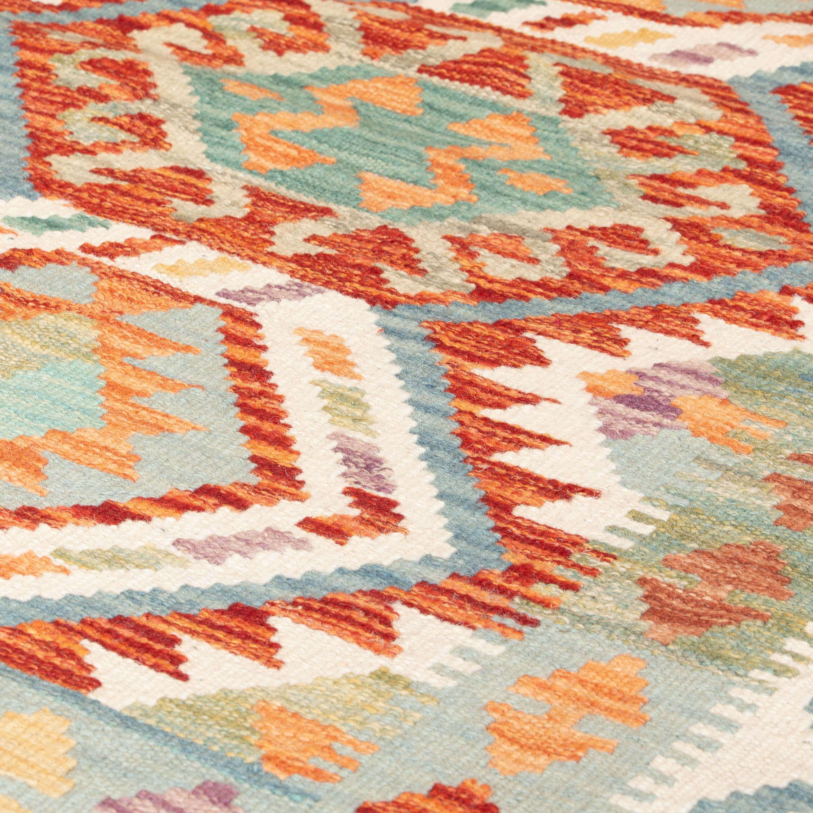 Experience the quality and tradition of Afghan craftsmanship with our handmade Kilim in terracotta, duck egg and green colours. This flat-weave kilim is woven from traditional, vegetable-dyed wool, making it durable and ideal for use with underfloor heating. Its colourful and striking design is reversible, allowing it to be used as a floor covering, wall hanging, or throw. Upgrade your space with this beautiful and inexpensive piece.