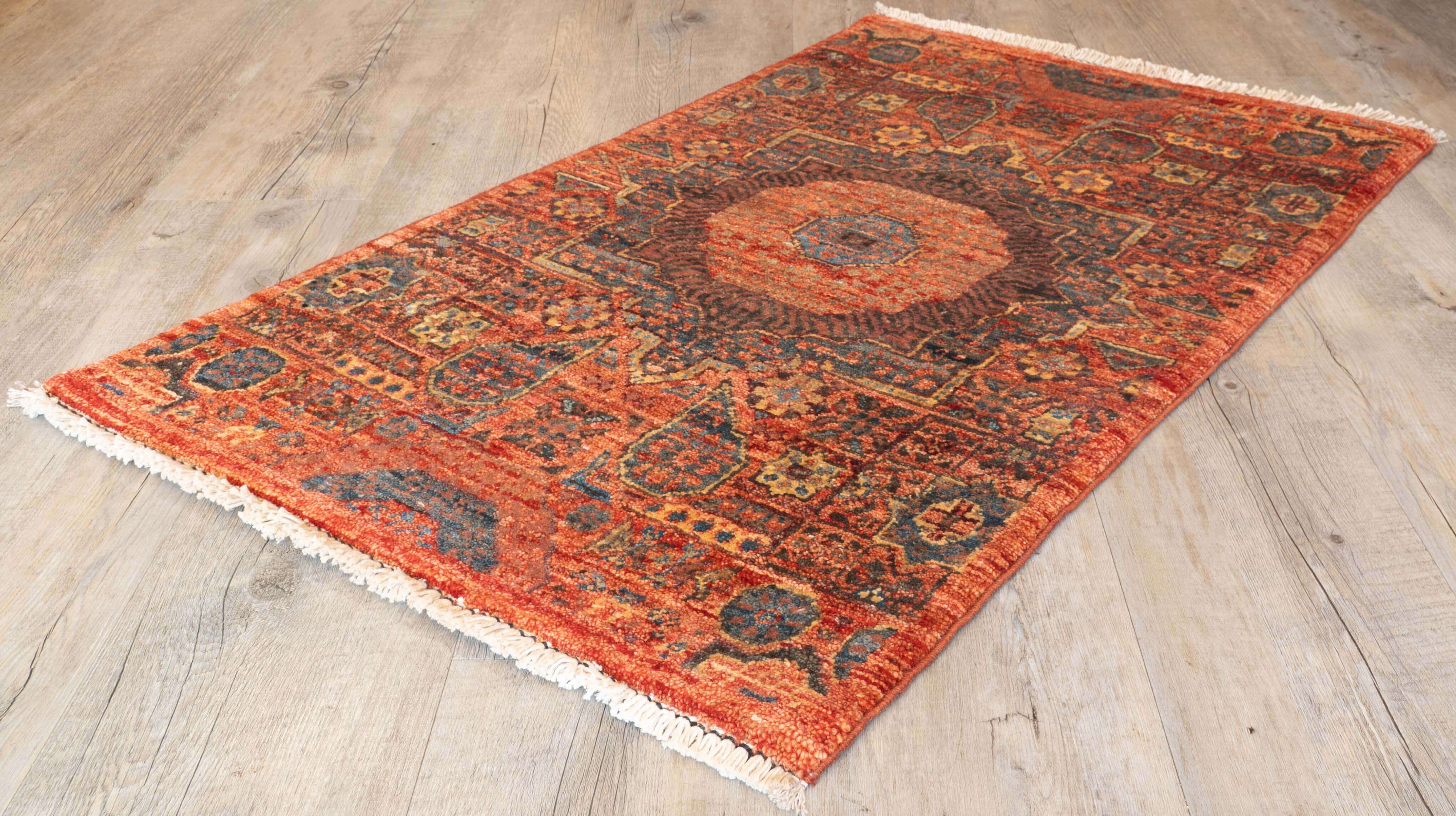 Crafted by skilled artisan weavers in northwest Afghanistan, this Handmade Afghan Mamluk rug showcases a traditional design passed down through generations. Made within a cottage industry using vegetable-dyed, hand-spun wool, it features a soft terracotta background highlighted with blue accents. Combining artistic heritage with durability, this rug is both practical and hardwearing, making it an exceptional choice for anyone seeking authentic craftsmanship and lasting quality.