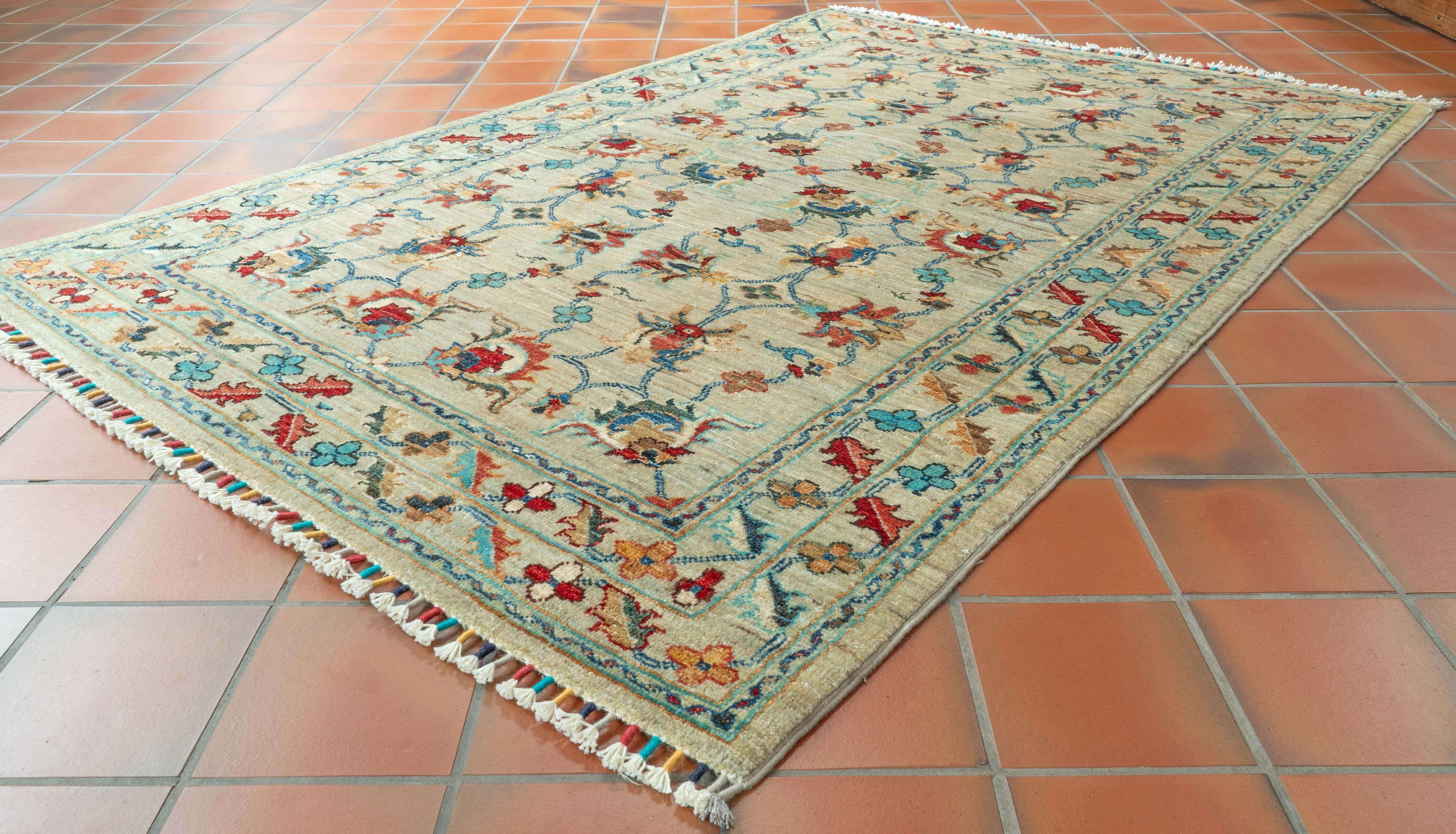 Originating from northwest Afghanistan, this pretty Sultani rug presents a classic all-over floral motif in refined, muted shades that embody timeless sophistication. Meticulously crafted from vegetable-dyed, handspun wool, balances robust durability with a soft, lustrous texture that elevates any interior setting. Each rug is a testament to the expert craftsmanship and artistic heritage passed through generations of skilled weavers, making it both a functional home accessory and a valuable cultural artefact. This premium-quality piece delivers lasting elegance and resilience, ideal for connoisseurs of genuine, handcrafted luxury.