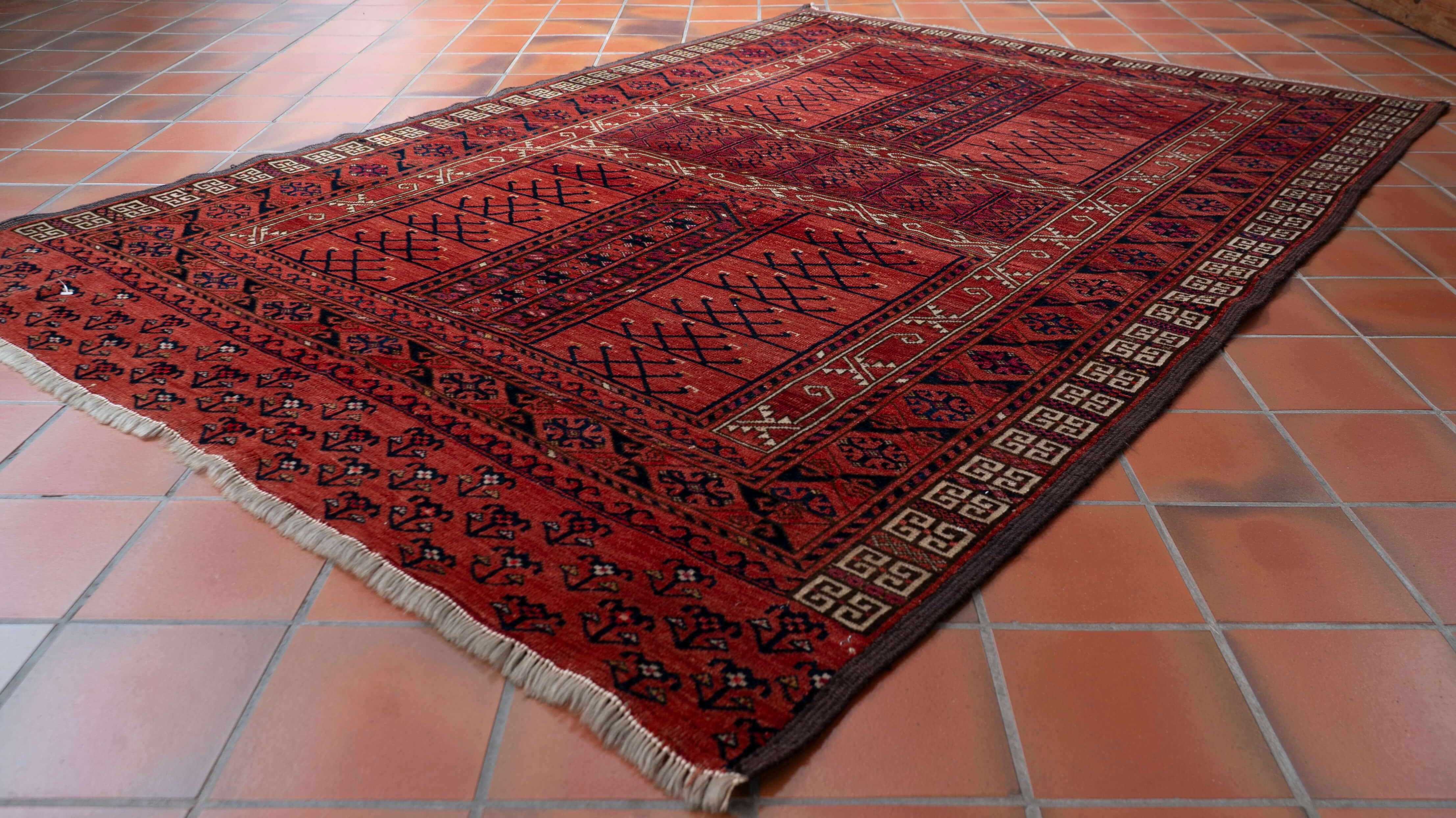 This exceptional Turkoman Hatchlu rug represents over a century of craftsmanship, handwoven by skilled artisans using time-honoured techniques. Originally designed as a decorative door covering for traditional yurts, it features a distinctive panelled composition that creates visual intrigue whilst remaining authentically functional. The vegetable-dyed wool displays a sophisticated, mellow palette that has deepened beautifully with age, whilst the delicate thin pile offers an unexpectedly soft, velvet-like texture. Constructed with goat-hair selvedges for durability, this genuine antique embodies the quality and character that only genuine age and natural materials can offer—a remarkable piece of textile heritage.