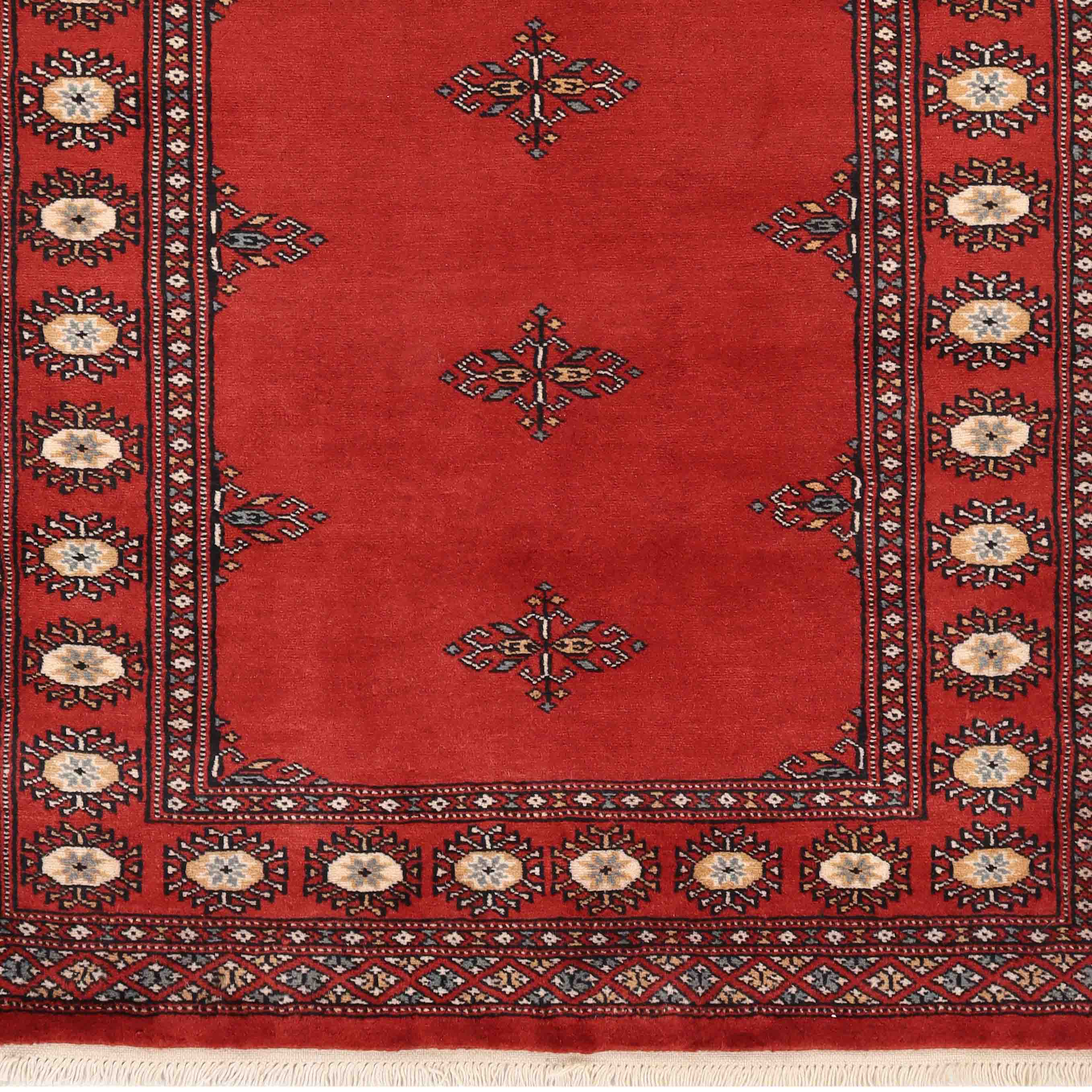 This Pakistan Bokhara rug is finely knotted in a traditional design using lovely, luxurious soft, silky wool. The Bokhara rugs are always made with a wool pile, but unfortunately, some people try to pass them off as silk. Handmade Bokhara rugs offer excellent value.