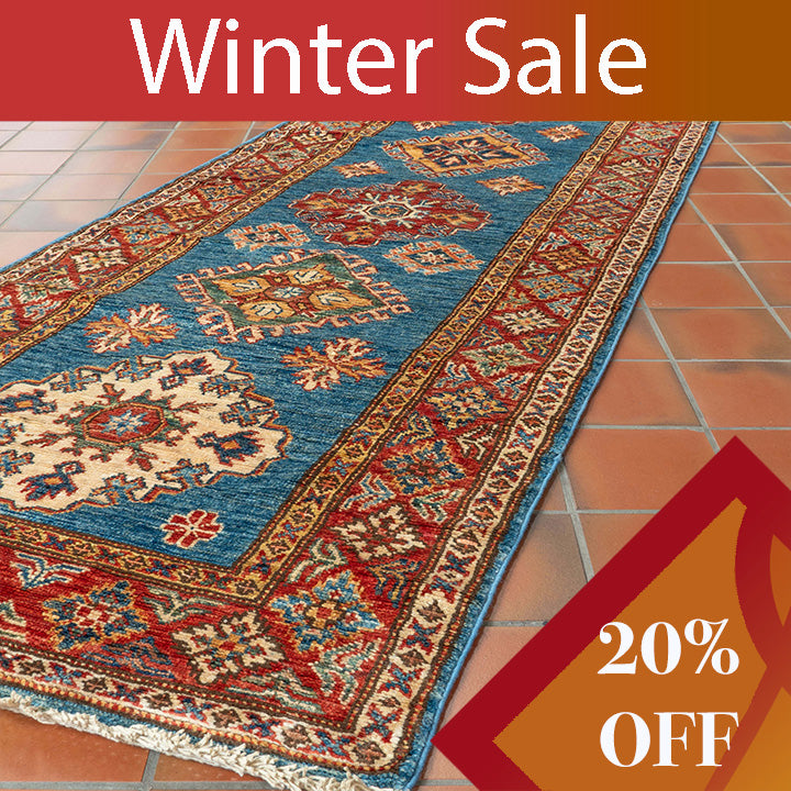 Handwoven by skilled artisan weavers in north-west Afghanistan, this fine Afghan Kazak medium runner embodies traditional craftsmanship nurtured through generations. Crafted within a cottage industry, it features vegetable-dyed, hand-spun wool known for its durability and practical resilience. The runner's blue background is accented by a red border, complemented by shades of gold, cream, and green. Its bold geometric pattern, inspired by designs originally from the Caucasus, makes it an ideal long runner for hallways, landings, or corridors, combining heritage artistry with everyday functionality.