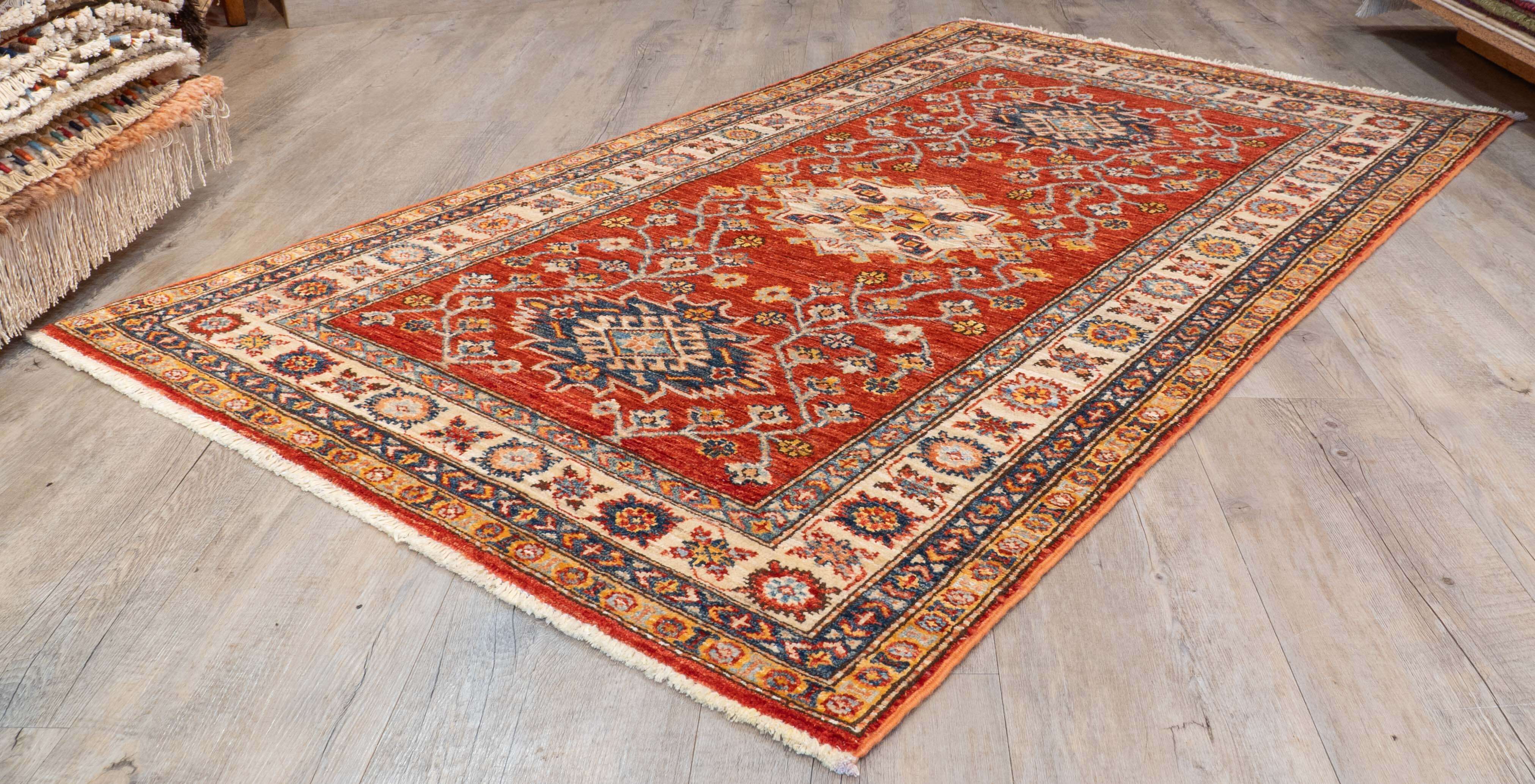 Handcrafted in the remote villages of northwest Afghanistan, this traditional Kazak rug represents generations of weaving mastery. Skilled artisans employ traditional techniques passed down through family lines, hand-spinning wool and colouring it with natural vegetable dyes. The striking design draws inspiration from classic Caucasian patterns, rendered in a vibrant palette of flame red, gold, cream and subtle blue tones. Built to withstand years of use, the fine-quality construction delivers both durability and a distinctive lustre throughout the pile. A statement piece that combines authentic craftsmanship with practical longevity.