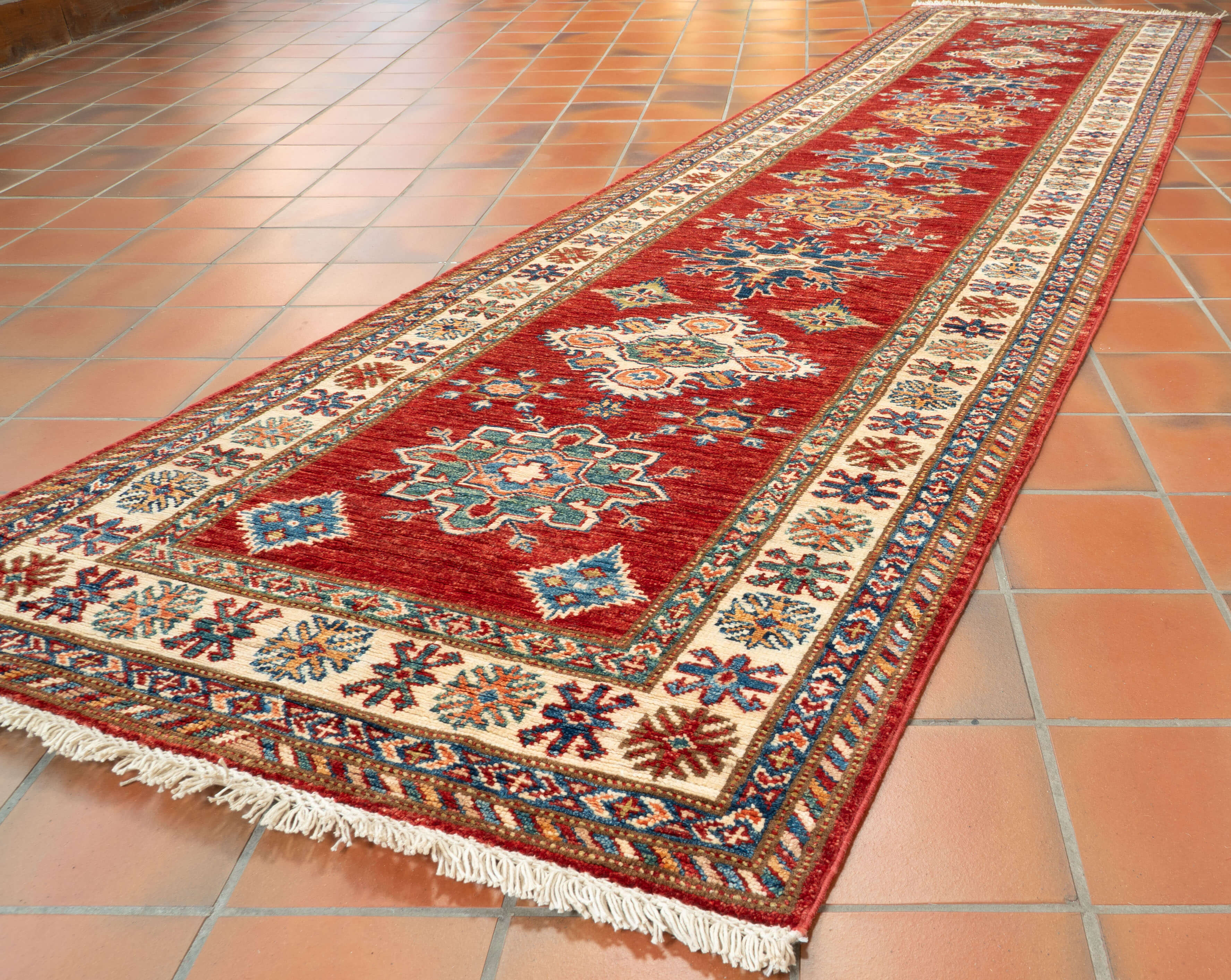 Handwoven by skilled artisan weavers in north-west Afghanistan, this fine Afghan Kazak short runner embodies traditional craftsmanship nurtured through generations. Crafted within a cottage industry, it features vegetable-dyed, hand-spun wool known for its durability and practical resilience. The runner’s rich red background is accented by a cream border, complemented by shades of blue, terracotta, and green. Its bold geometric pattern, inspired by designs originally from the Caucasus, makes it an ideal long runner for hallways, landings, or corridors, combining heritage artistry with everyday functionality.