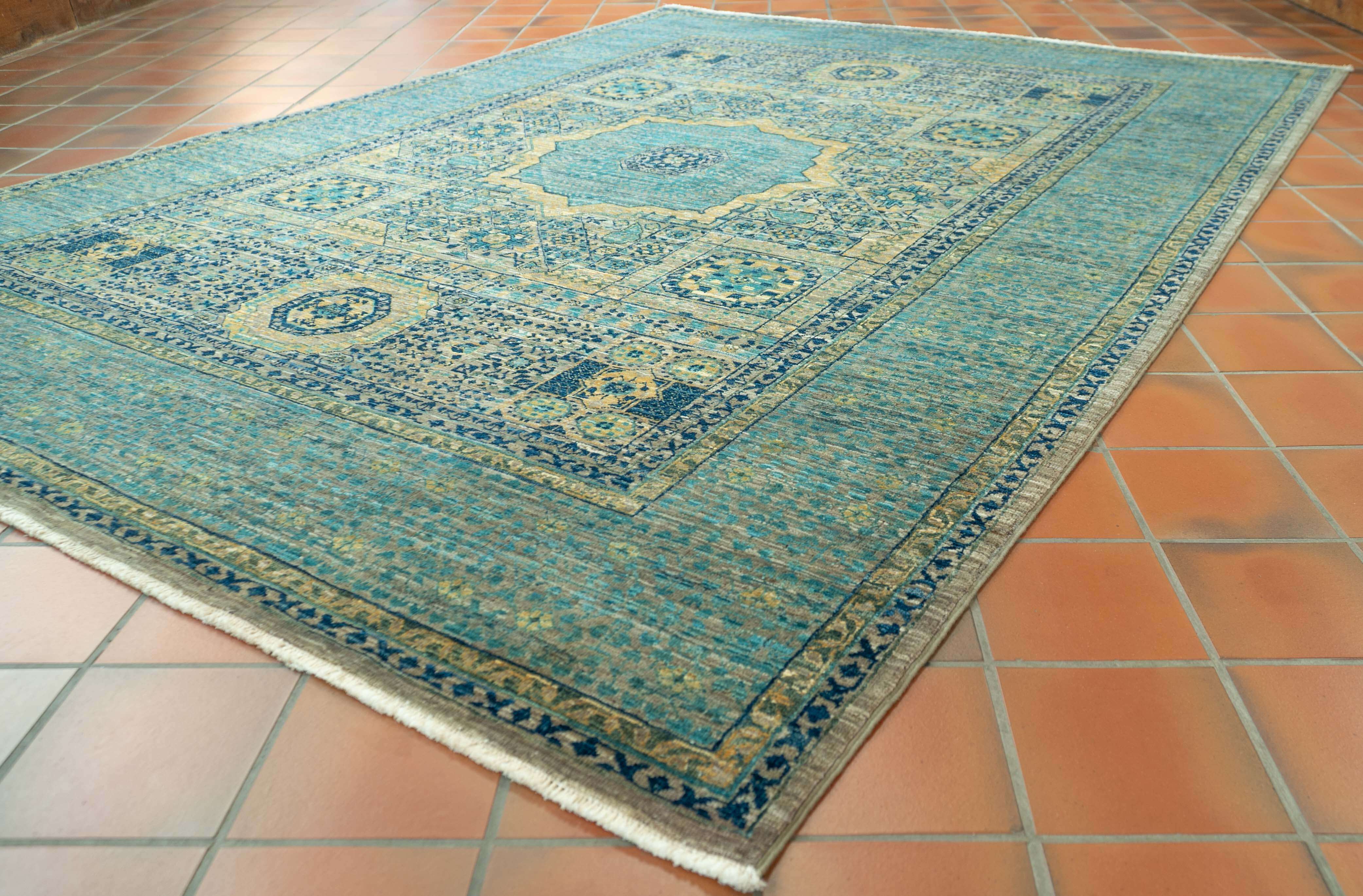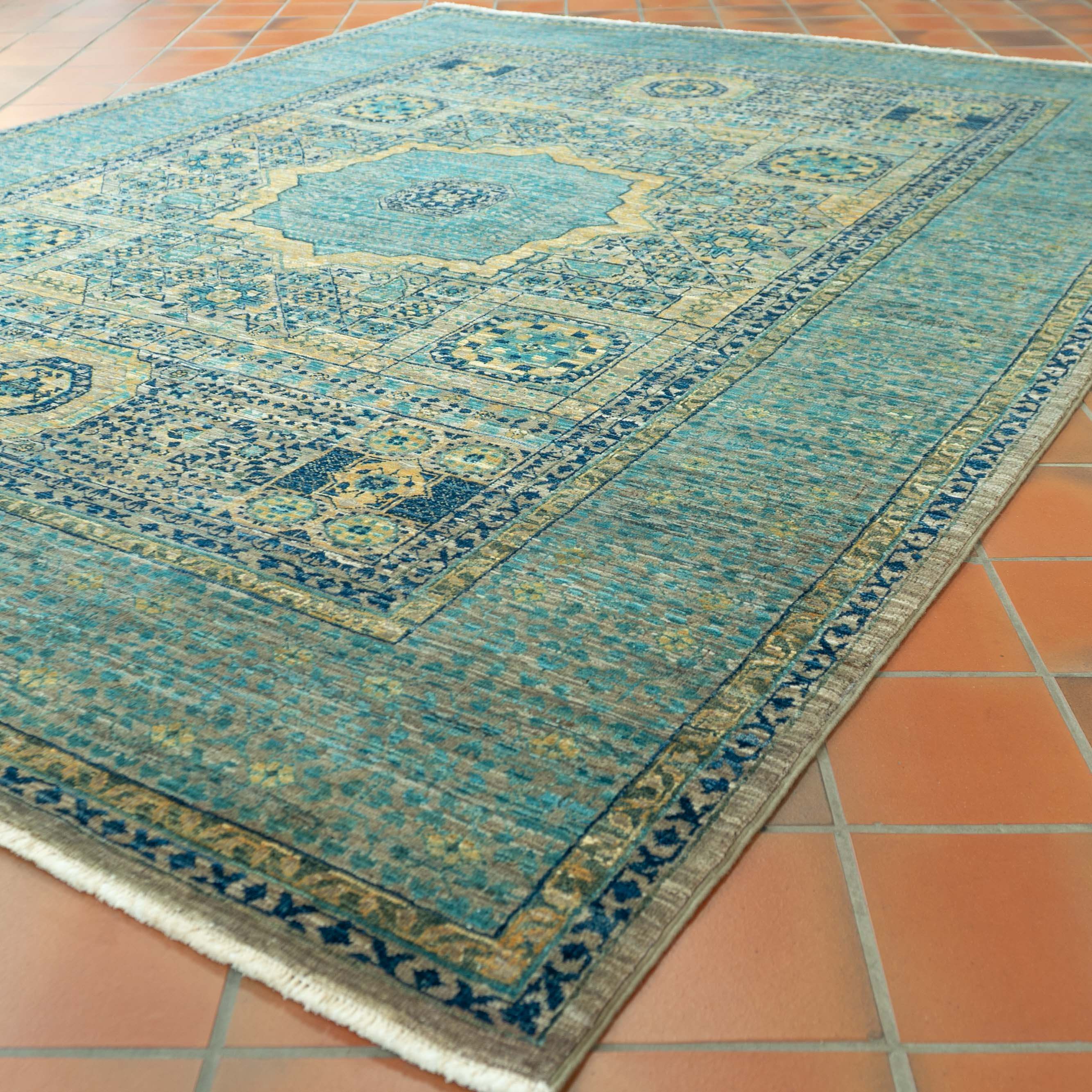 The history of these ancient Egyptian carpet designs could be traced to the 'Mamluk Dynasty' around 1250; these Turkic descendants established a thriving carpet industry in Cairo in the 15th century. In recent years, many Afghan weavers have been interested in traditional designs such as Mamluk, which they reinterpret, paying particular attention to new colours not traditionally used. As you might expect, these pieces are handmade, often using traditional vegetable dyes on cotton foundations. The final finishing process, such as surface clipping and herbal washing, is generally undertaken in Pakistan. The Afghan Mamluk carpets at Jennings Rugs are amongst the most prized pieces, with a level of detail that often surpasses that of Persian (Iranian) Oriental carpets. The fine weave and beautiful wool make these pieces very desirable.