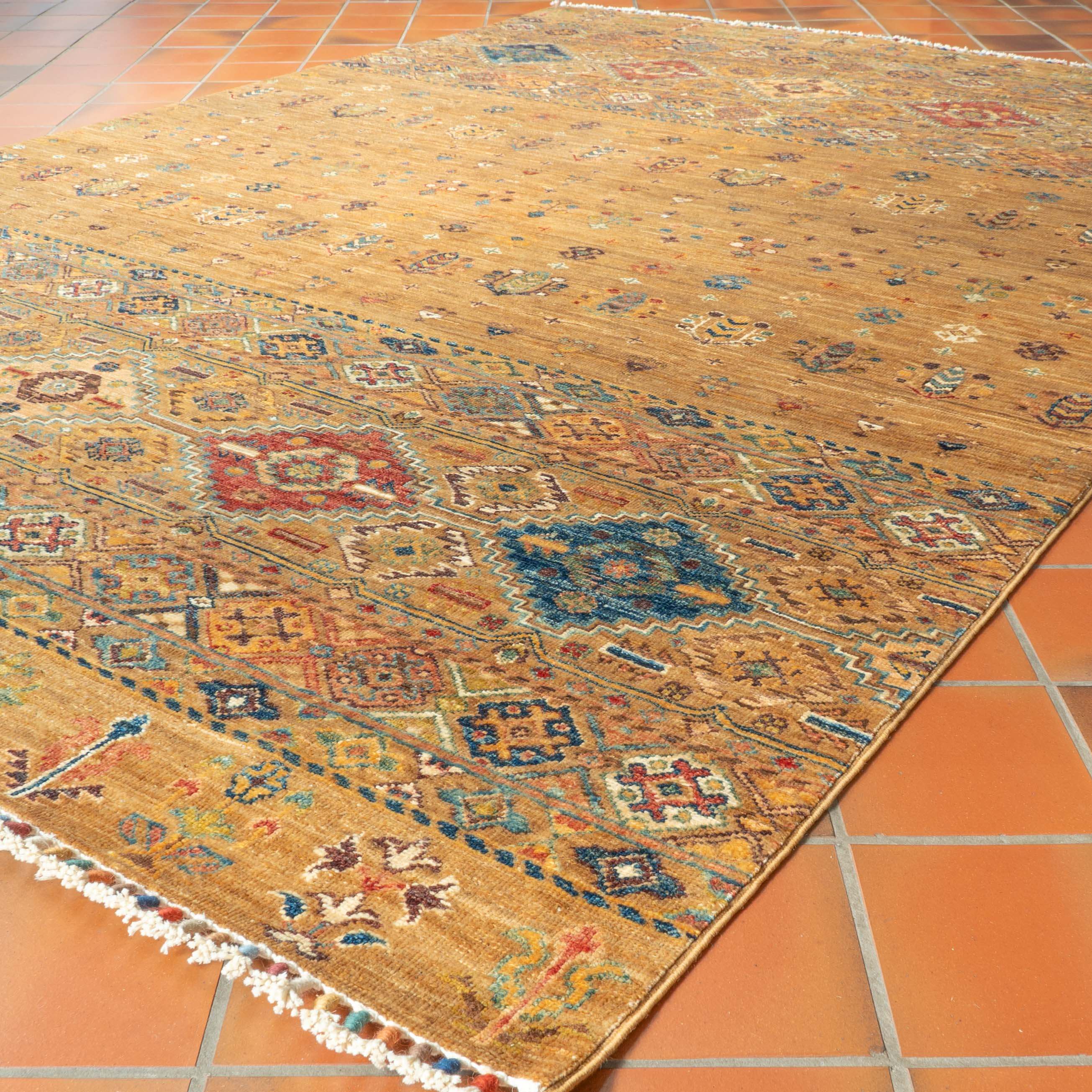 This exquisite, fine-quality gold Afghan Samarkand rug is expertly handcrafted by skilled artisan weavers from north-west Afghanistan, preserving traditional techniques passed down through generations. Produced within a cottage industry, it features handspun wool dyed with natural vegetable pigments, ensuring authentic colour depth and durability. The carpet’s robust construction balances practicality with artistic finesse, blending classic Afghan motifs with subtle contemporary influences. Its refined palette of soft, harmonious colours makes it an enduring and versatile piece suitable for discerning environments.