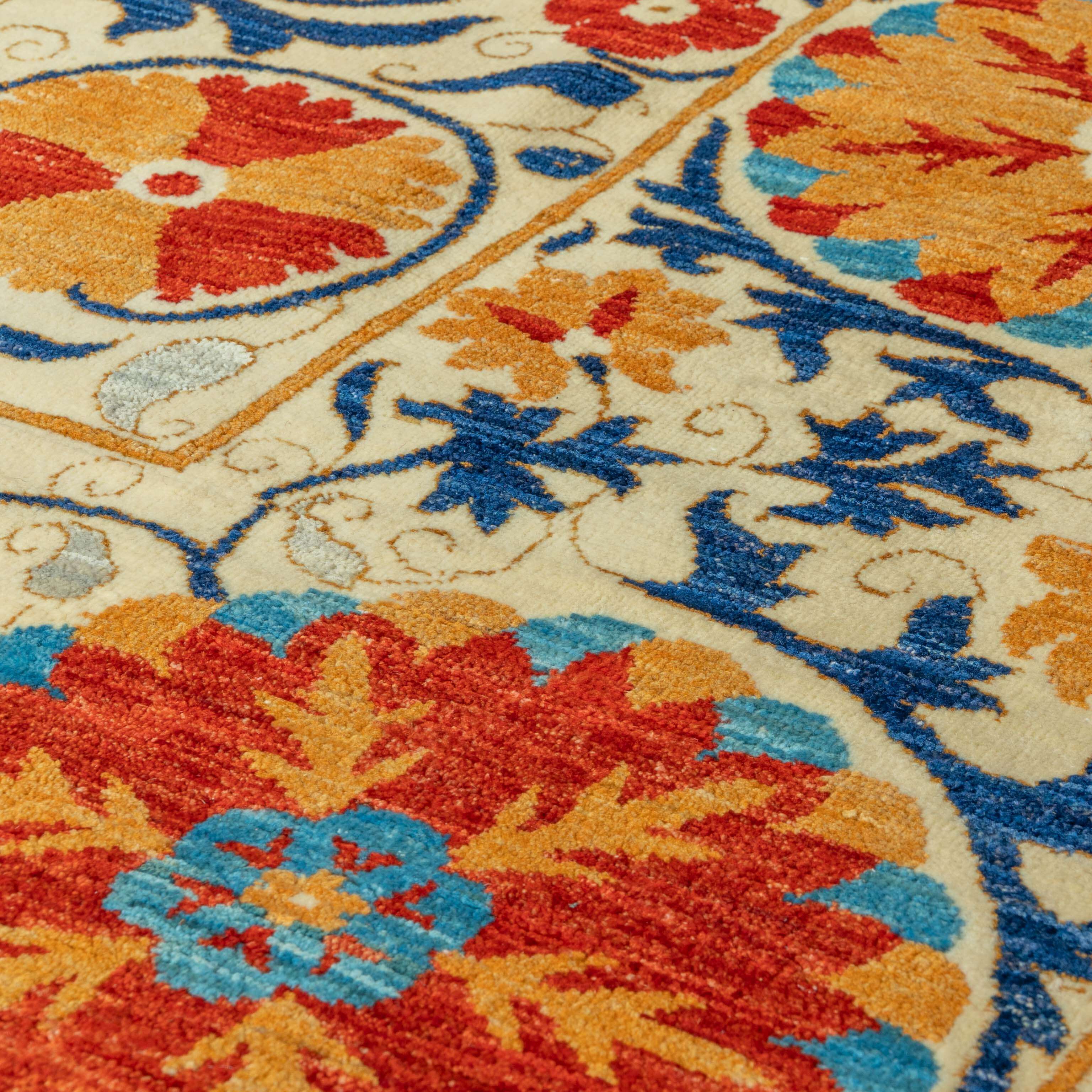 This distinguished Afghan Suzani represents the pinnacle of traditional weaving craftsmanship. Produced within a north-west Afghan cottage industry, each piece is hand-woven by master artisans employing vegetable-dyed, hand-spun wool and techniques refined across generations. The design draws from Uzbek aesthetic principles, presenting a cream ground punctuated by carefully considered tones of dark blue, flame red, apricot and pale blue. The construction delivers exceptional durability without compromise to visual refinement, exemplifying the superior quality inherent to authentic artisanal production.