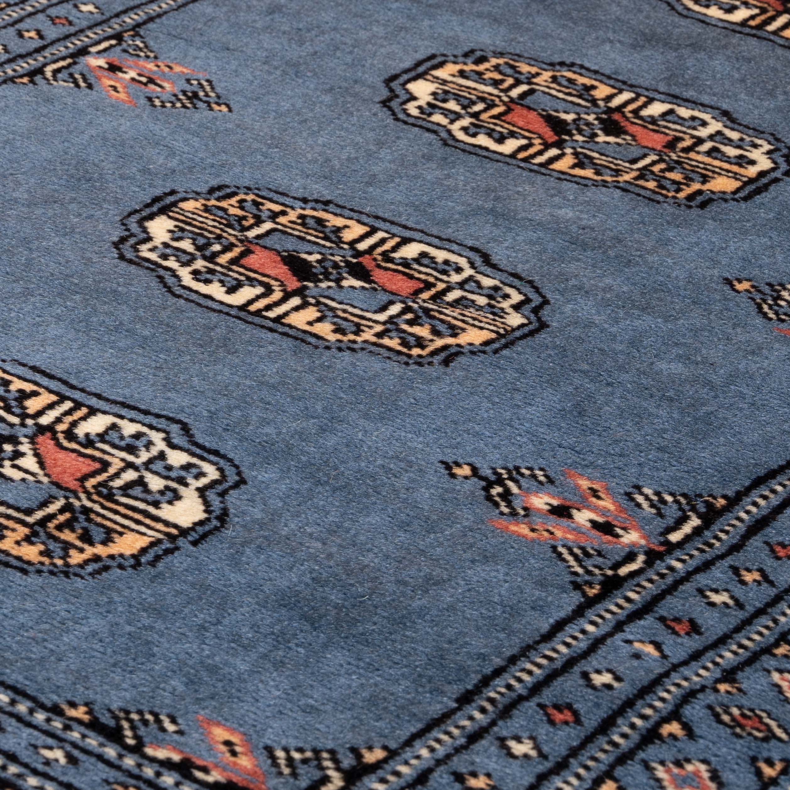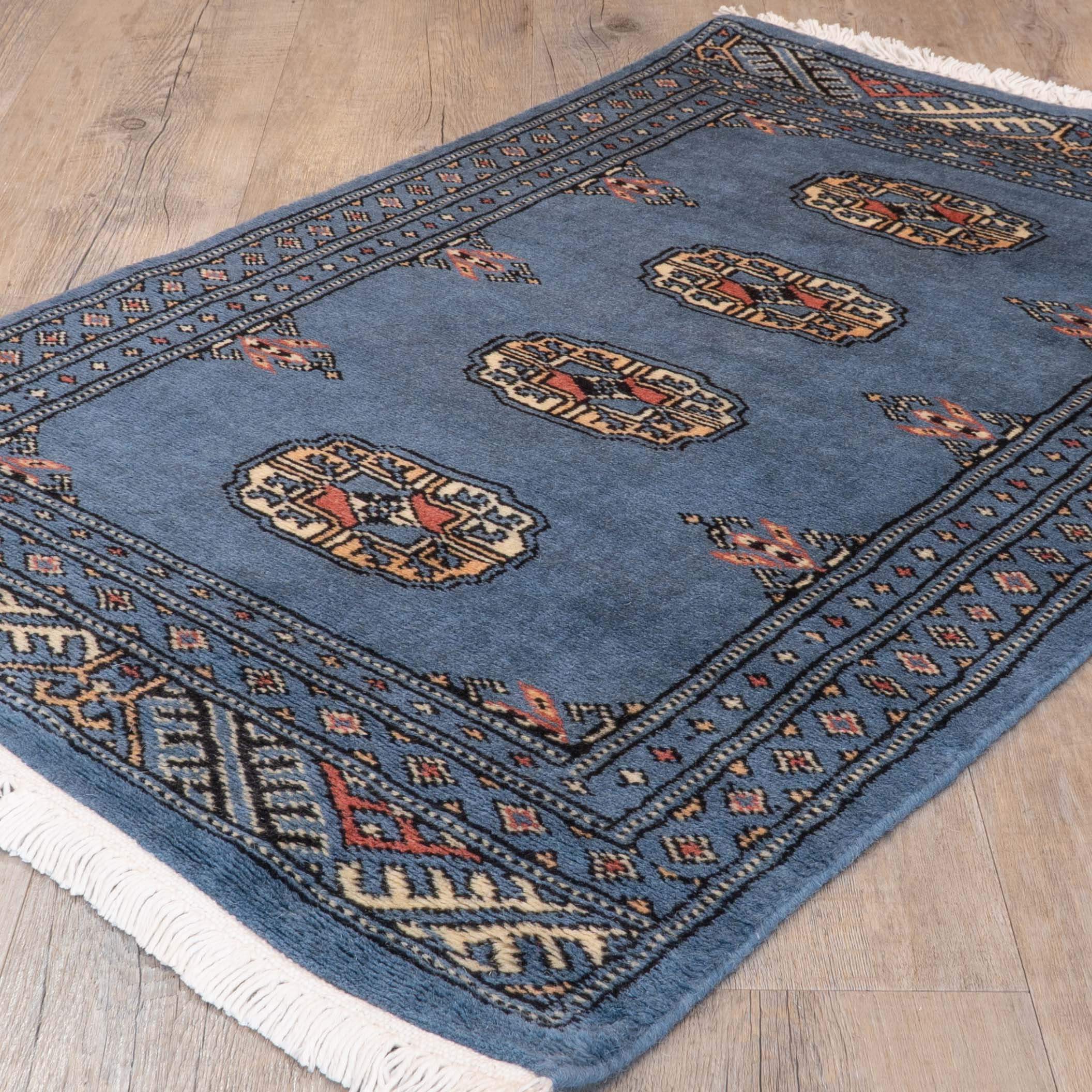 Handmade by skilled weavers in villages around Lahore in northern Pakistan. This traditional design comes in a range of different colours and sizes. The background of this piece is a steel blue colour with touches of rose pink and apricot.Please click the hyperlinks below if you are interested in additional information.This Pakistan Bokhara rug is finely knotted in a traditional design using lovely, soft, silky wool. The Bokhara rugs are always made with a wool pile, but unfortunately, some people try to pass them off as silk. Handmade Bokhara rugs are incredibly good value. The well-known Bokhara design originated in Uzbekistan, where...