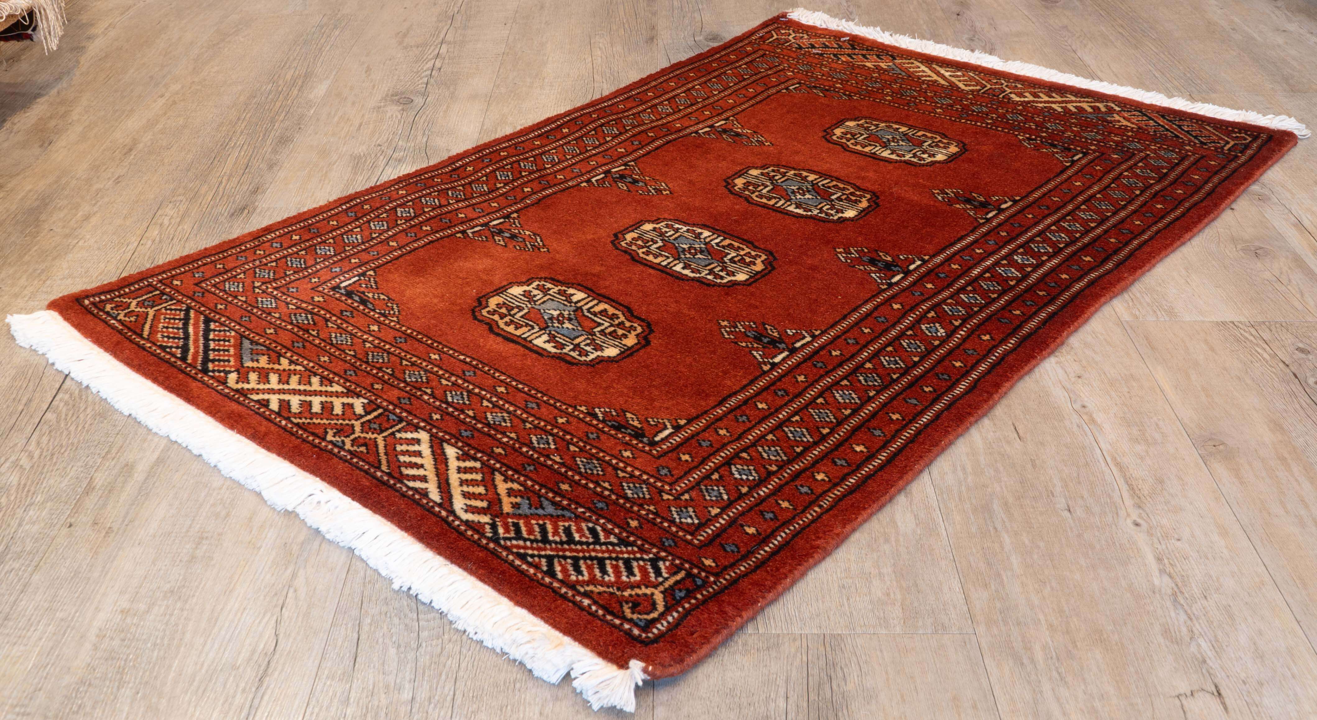The well-known Bokhara design originates from Uzbekistan, where the nomadic Turkoman tribespeople first took their rugs to be sold. The repetitive octagonal motif, known as a "gul" (Persian for "rose"), is a characteristic feature of Bokhara rugs. Today, Pakistani people weave this design in a wide range of colours and sizes.