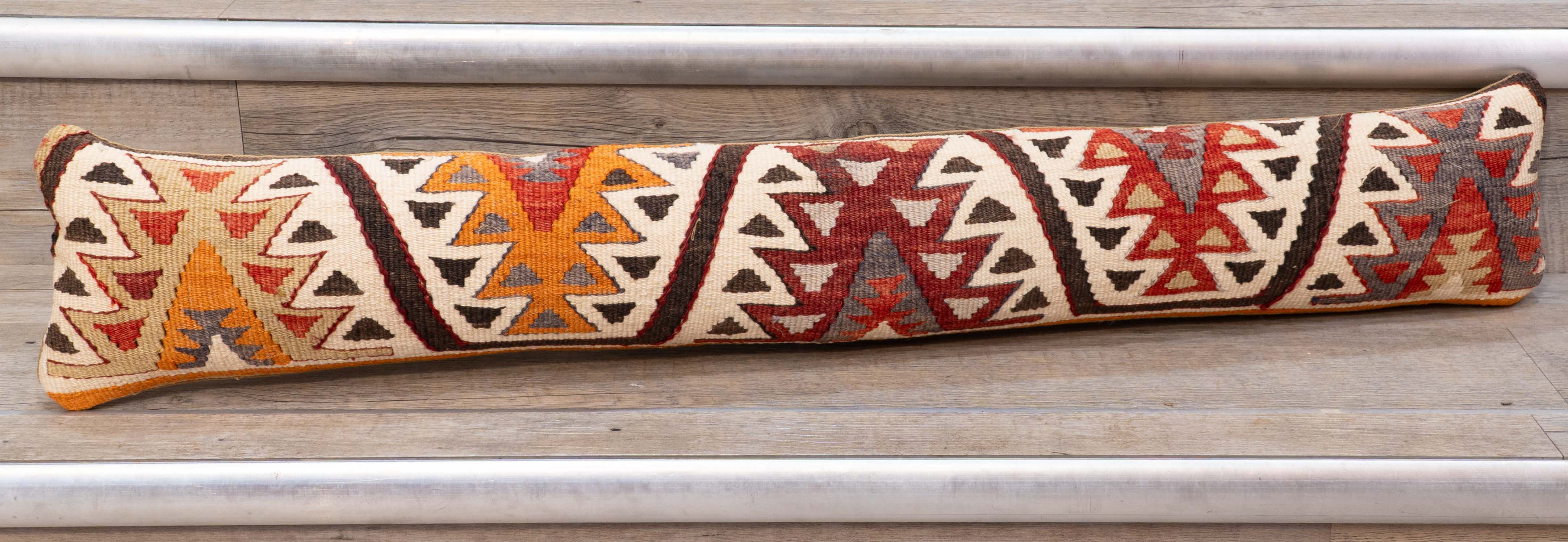 We are fortunate to have these draught excluders on the website; the old kilims are becoming harder to find and quite desirable. This lovely draught excluder is made from a salvaged piece of Turkish Kilim. It is single-faced, with a faux-suede/linen backing and fibre fill. Each draught excluder is unique and not repeatable.