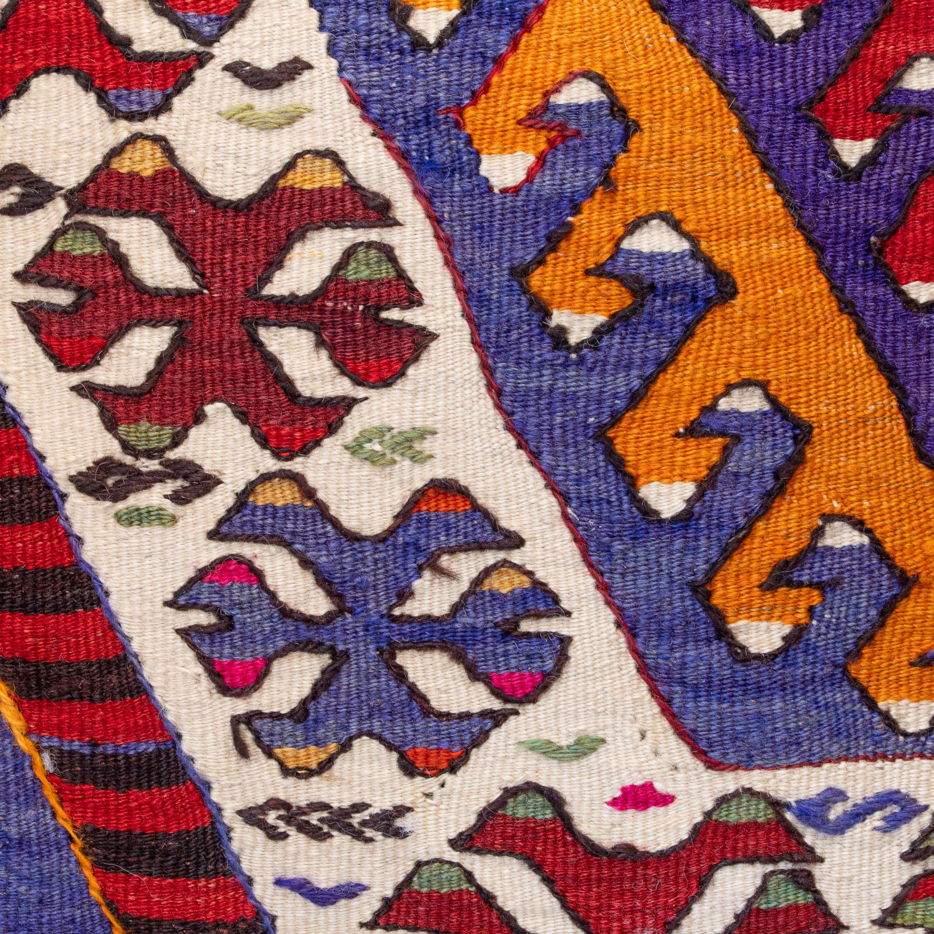 Our collection of kilim cushions offers great colours, designs and textures. The pieces are often taken from a larger old, sometimes antique kilim, cleaned and sorted to repurpose and salvage a treasured fabric that otherwise could be lost. The pattern may be cut in unusual and interesting ways to ensure as much of this precious resource can be saved. In addition, the cushions are fibre-filled, making them more suitable for individuals with allergies to feather fillings.  Product size: 50 x 50cm (20" x 20")