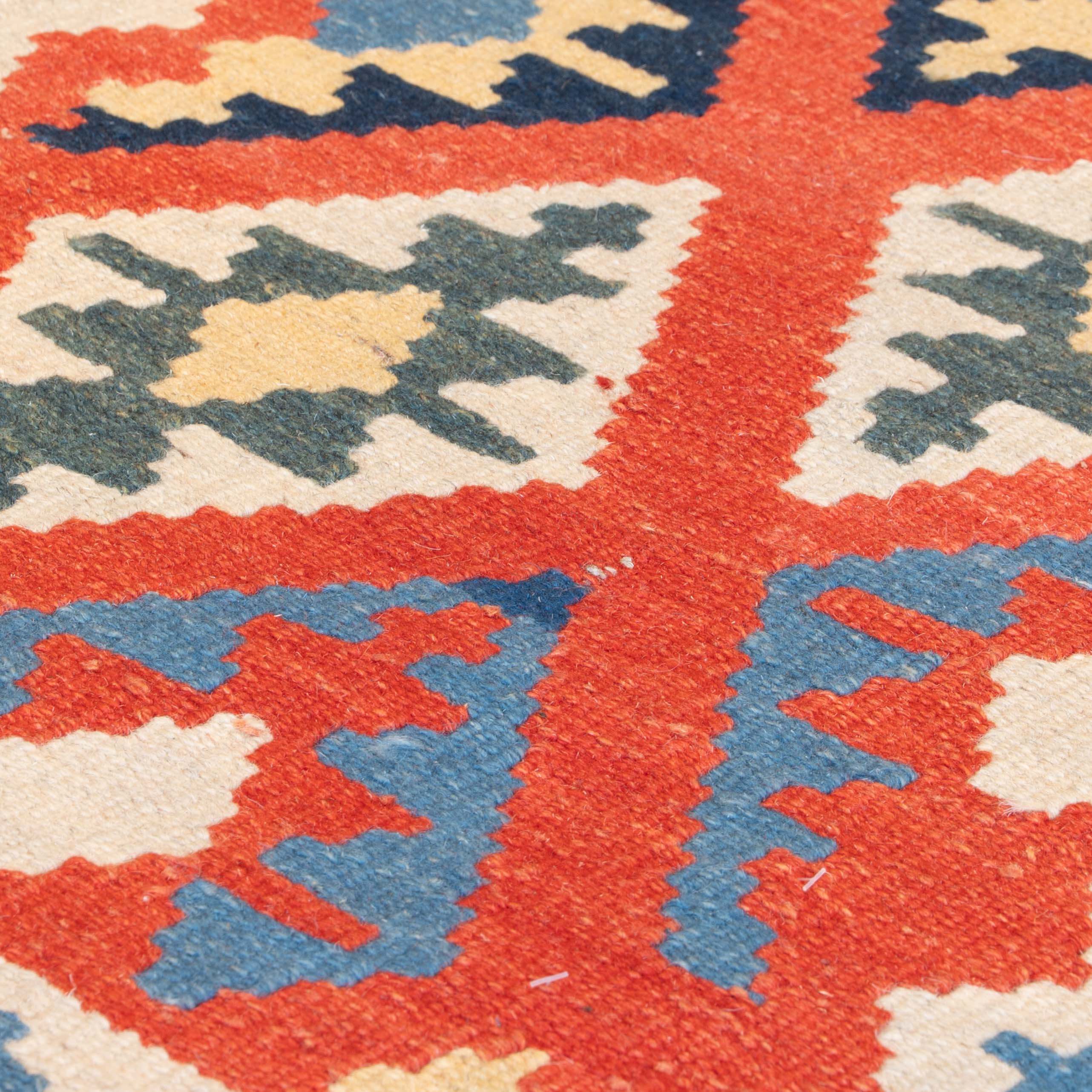 Discover traditional Qashqai craftsmanship in this colourful handwoven kelim. Rich blues, greens, and terracotta tones blend seamlessly across traditional geometric patterns that tell a story of cultural heritage. Crafted entirely from 100% wool, this reversible textile adapts to your décor—flip it to refresh your space instantly. Durable enough for everyday use yet refined enough to become a focal point, it's the perfect choice for those who value genuine artisanal quality and timeless design over mass-produced alternatives.
