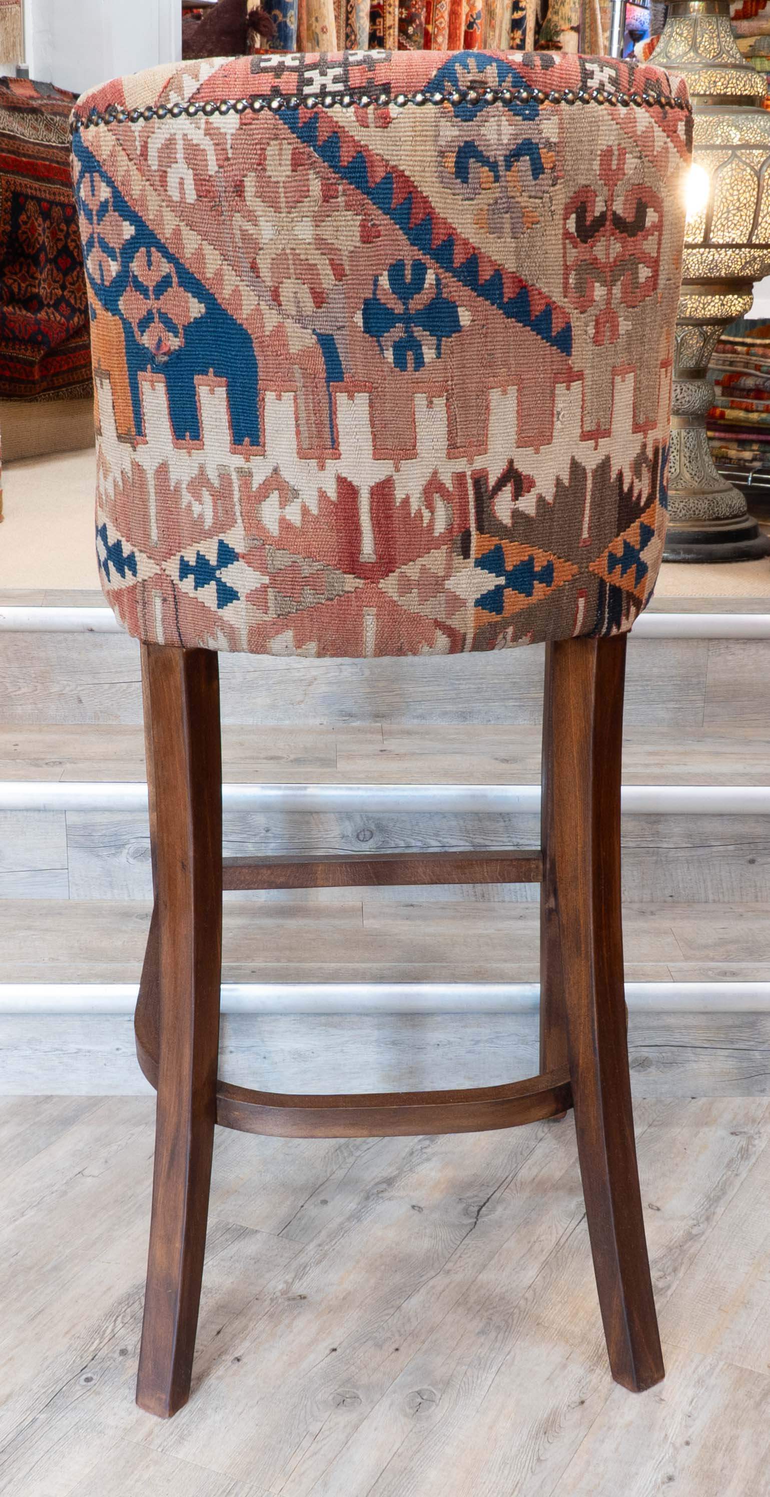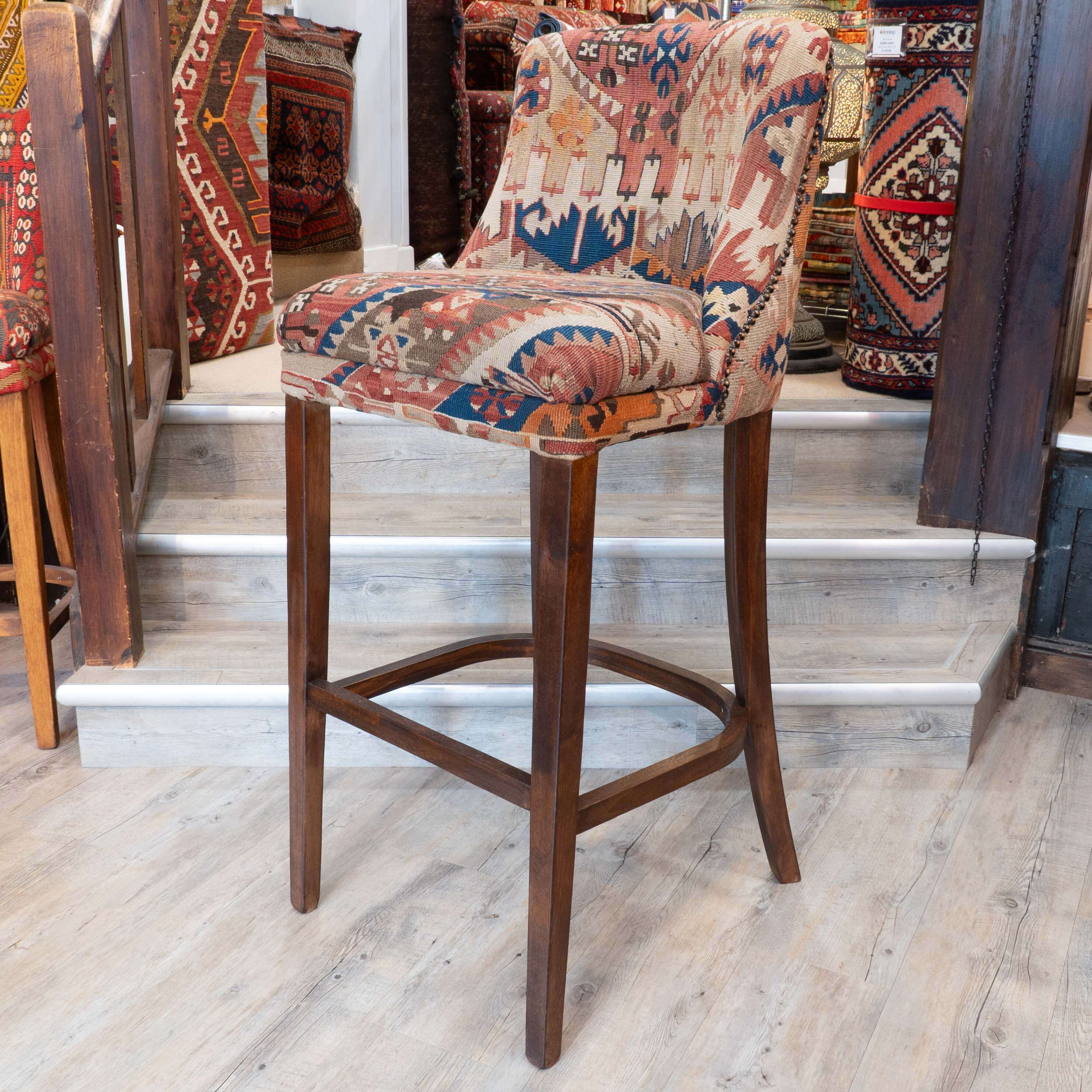 These interesting barstools are very smart. The salvaged Kilim has been repurposed into high stools, which will be a fabulous addition for anyone seeking something extra special and unique. Each piece of Kilim has been expertly placed to full effect; although we can't do multiple identical chairs, we try to get them made as 'Jack & Jill' pairs. Of course, if anyone requires more, we can cut kilims from the same piece to create a set more like a 'harlequin set'. Don't hesitate to contact us to discuss this if needed. Finally, the chairs were studded around the back, and the wood was polished with Danish wax to a medium oak.