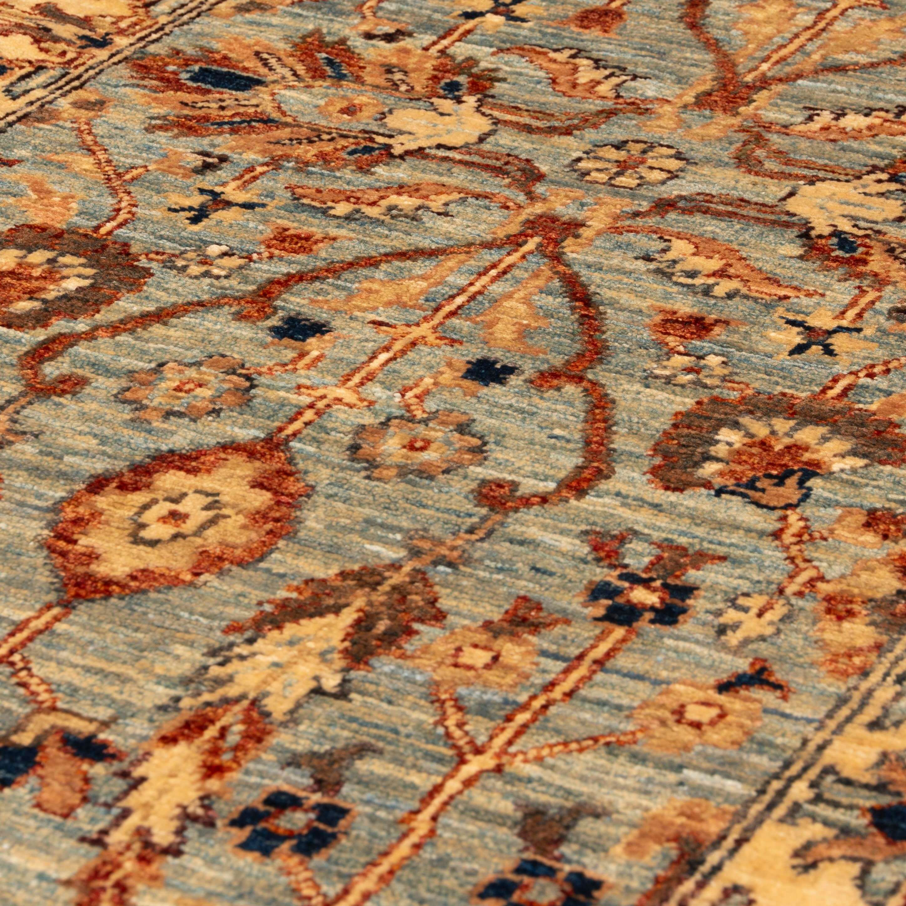 This unique and varied collection is produced in northwest Afghanistan and features construction similar to that of Ziegler rugs. The wool is hand-sheared from the indigenous Karukal sheep. It is then hand-spun and coloured using natural vegetable and mineral dyes. These pieces have utilised attractive old Persian designs and patterns from unusual museum pieces. They are generally more vibrant colours and less muted shades. However, the exciting and uplifting colours remain almost Jewel-like. The final finishing processes are carried out in Pakistan, where some post-production occurs, including alignment corrections, surface clipping and tumbling, and the washing mentioned earlier.