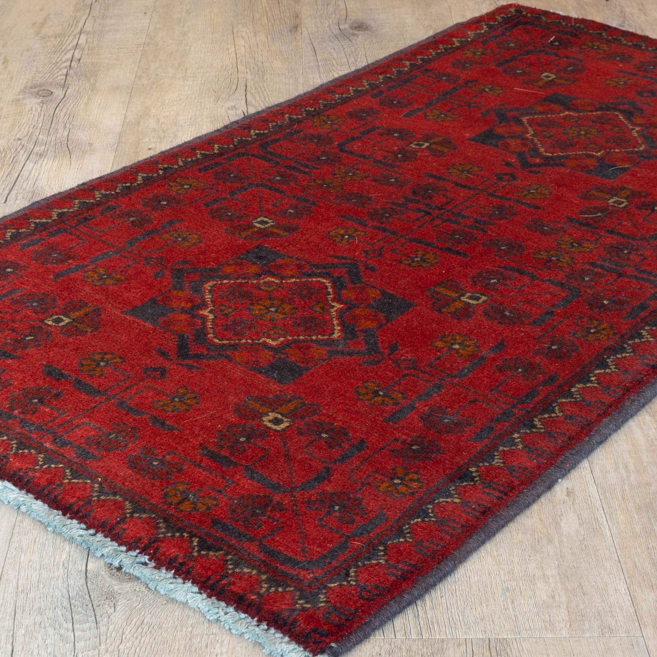 The rich red of these rugs is created from boiling the madder plant's root, which grows wild in that part of the world. They are finely knotted from wool of the Karakul sheep, which graze the mountainous terrain. The colour and design make them very practical. Some recurring motifs are guls (elephant-foot patterns and octagonal, often curvilinear flowers in dark blue, ochre, and beige. We have an extensive collection of handmade Afghan Khal Mohammadi rugs and carpets in various sizes, available online and in-store. Why not come to Tewkesbury and find a beautiful carpet that suits your needs?