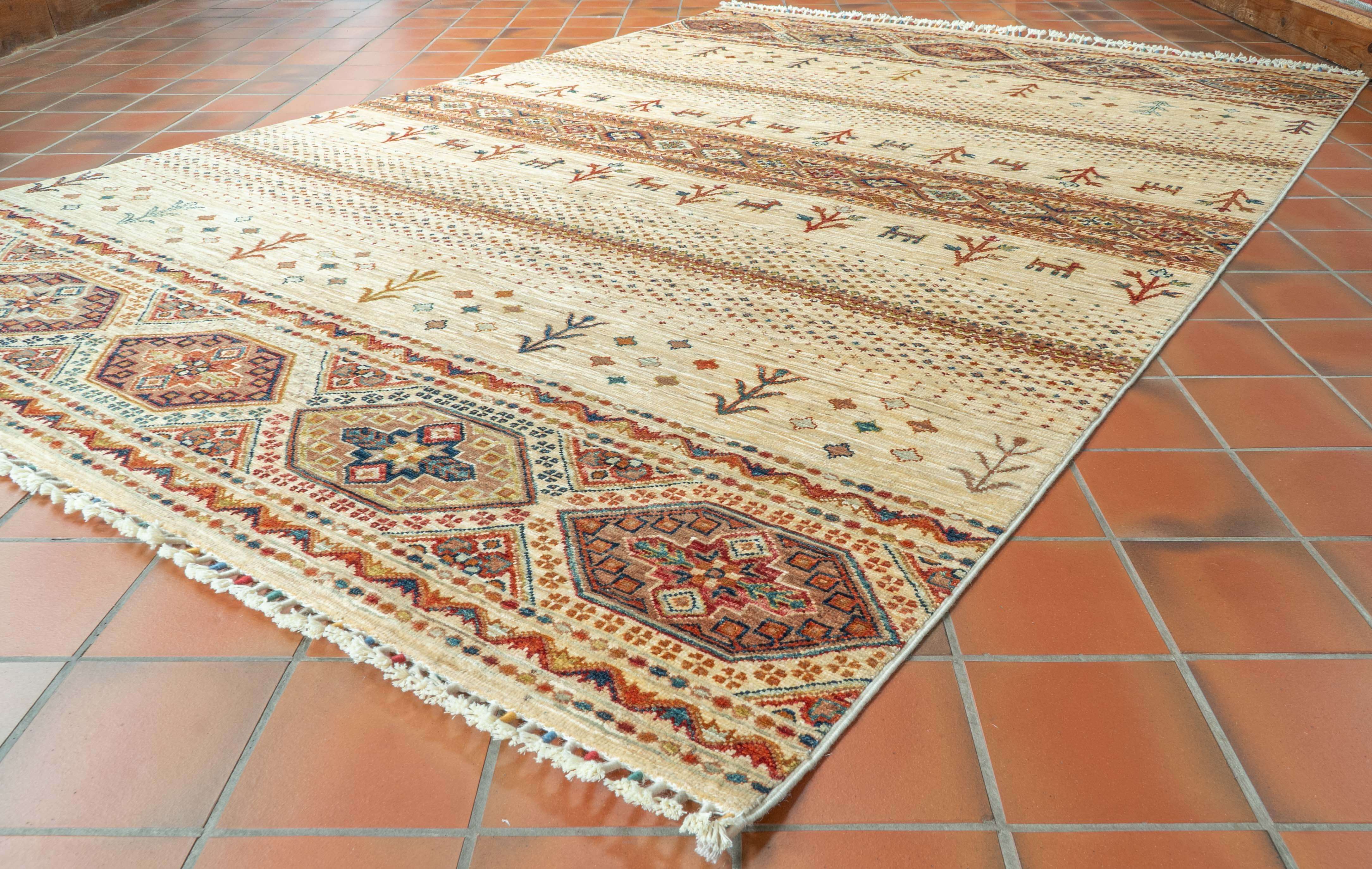 Kharjeen (Khorjin) rugs, runners, and carpets are still hand-knotted, and the wool is dyed with vegetable dyes. The Kharjeen (also known as Khurjeen) rug designs can be reminiscent of Gabbeh designs. The colours of the Kharjeen rugs and carpets are similar in many ways to those used in our Samarkand and Loribaft collections. Some Kharjeen pieces do not have fringes and are finished with a plain kilim end or binding secured to prevent fraying. The other rugs are generally produced like the Samarkand carpets with an unusual bobbin wind on the warps.