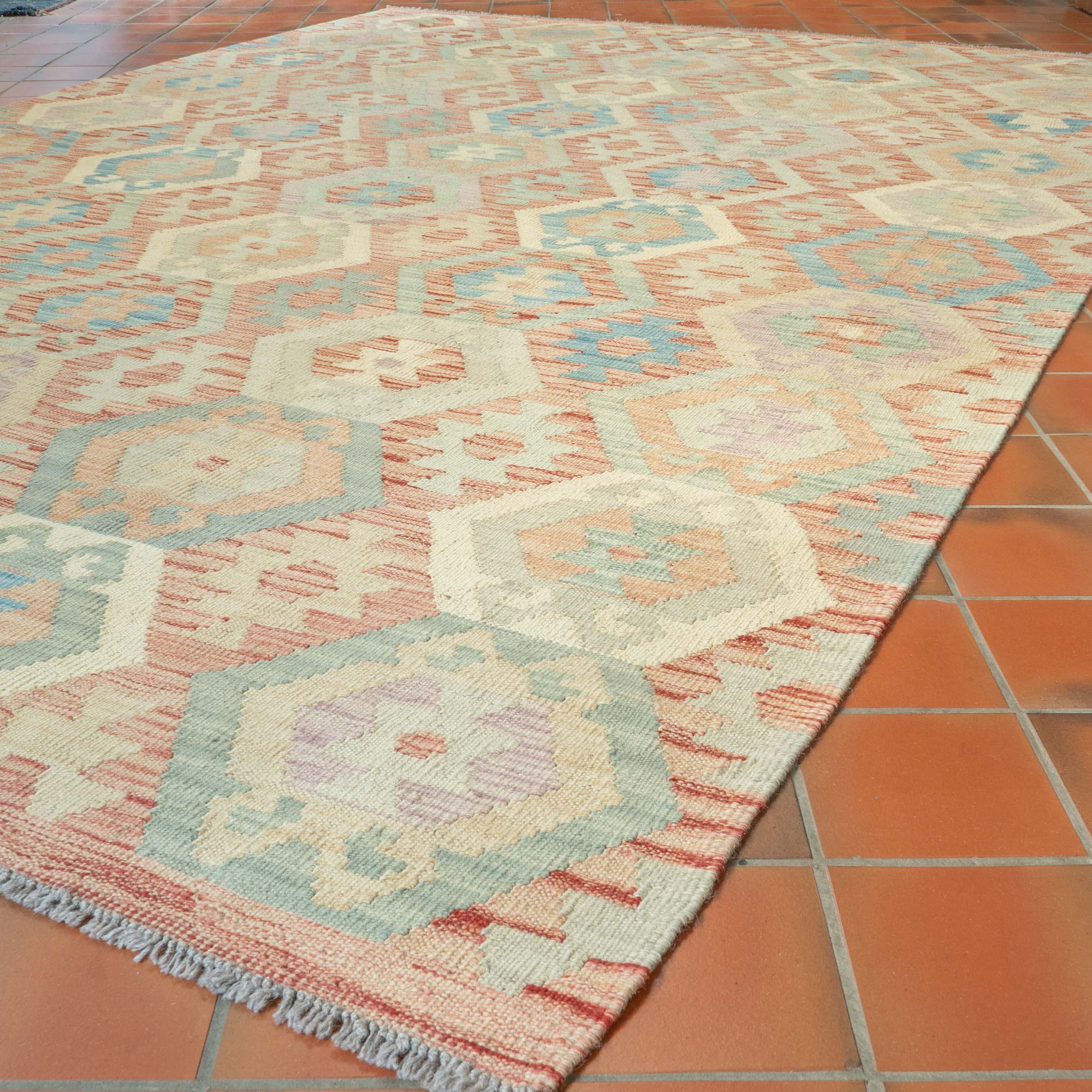 This flat-weave kilim is woven from traditional, vegetable-dyed wool, making it durable and ideal for use with underfloor heating. Its soft, muted colourings and geometric design are reversible, allowing it to be used as a floor covering, wall hanging, or throw. Elevate your space with this stunning and affordable piece. Experience the quality and tradition of Afghan craftsmanship with our handmade Kilim.