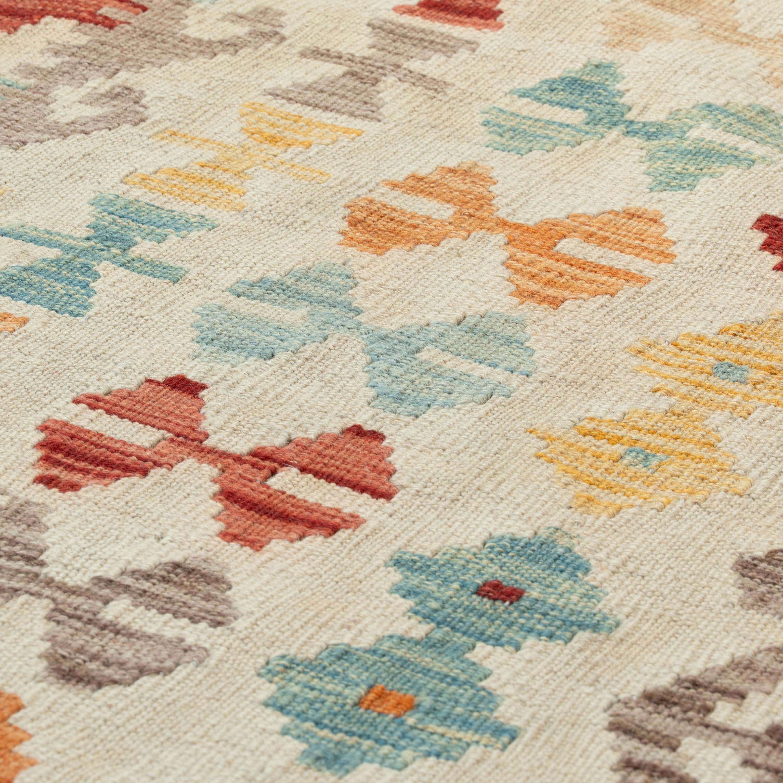 Experience the quality and tradition of Afghan craftsmanship with our large handmade Kilim in soft neutral shades. This flat-weave kilim is woven from traditional, vegetable-dyed wool, making it durable and ideal for use with underfloor heating. Its colourful and striking design is reversible, allowing it to be used as a floor covering, wall hanging, or throw. Elevate your space with this stunning and affordable piece.
