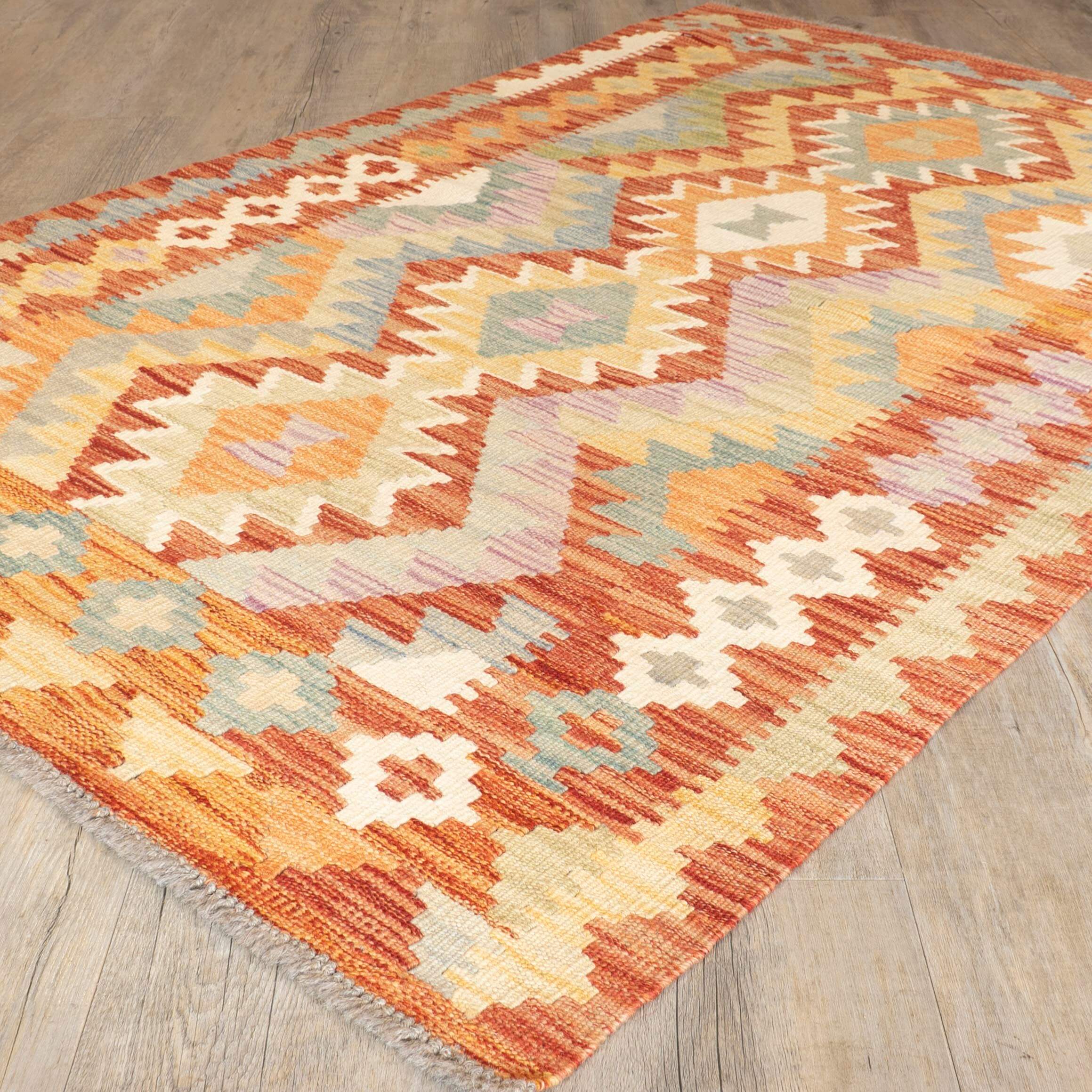 Experience the quality and tradition of Afghan craftsmanship with our handmade Kilim in sft muted tones. This flat-weave kilim is woven from traditional, vegetable-dyed wool, making it durable and ideal for use with underfloor heating. Its colourful and striking design is reversible, allowing it to be used as a floor covering, wall hanging, or throw. Upgrade your space with this beautiful and inexpensive piece.