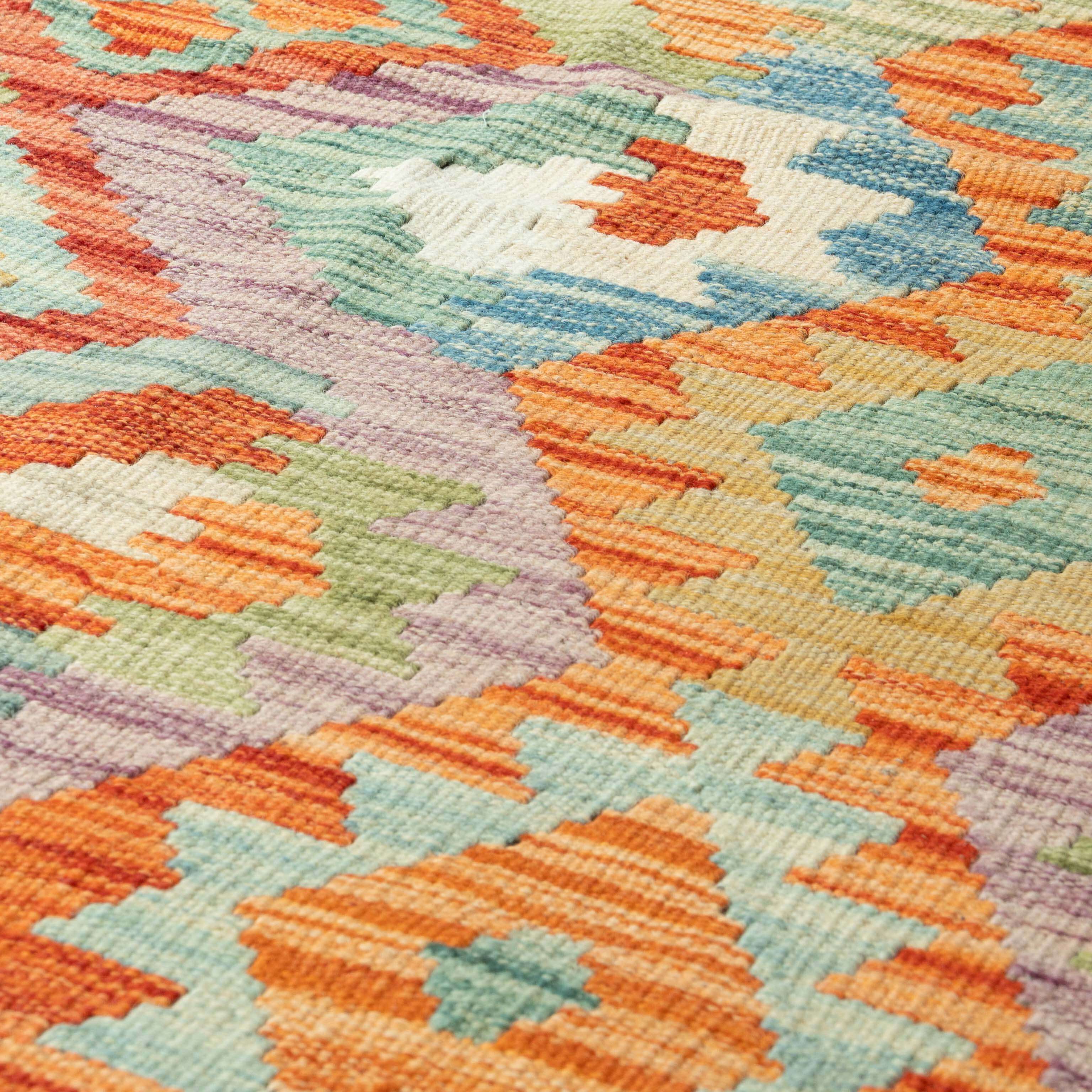 Experience the quality and tradition of Afghan craftsmanship with our large, multi-coloured handmade Kilim. This flat-weave kilim is woven from traditional, vegetable-dyed wool, making it durable and ideal for use with underfloor heating. Its colourful and striking design is reversible, allowing it to be used as a floor covering, wall hanging, or throw. Elevate your space with this stunning and affordable piece.