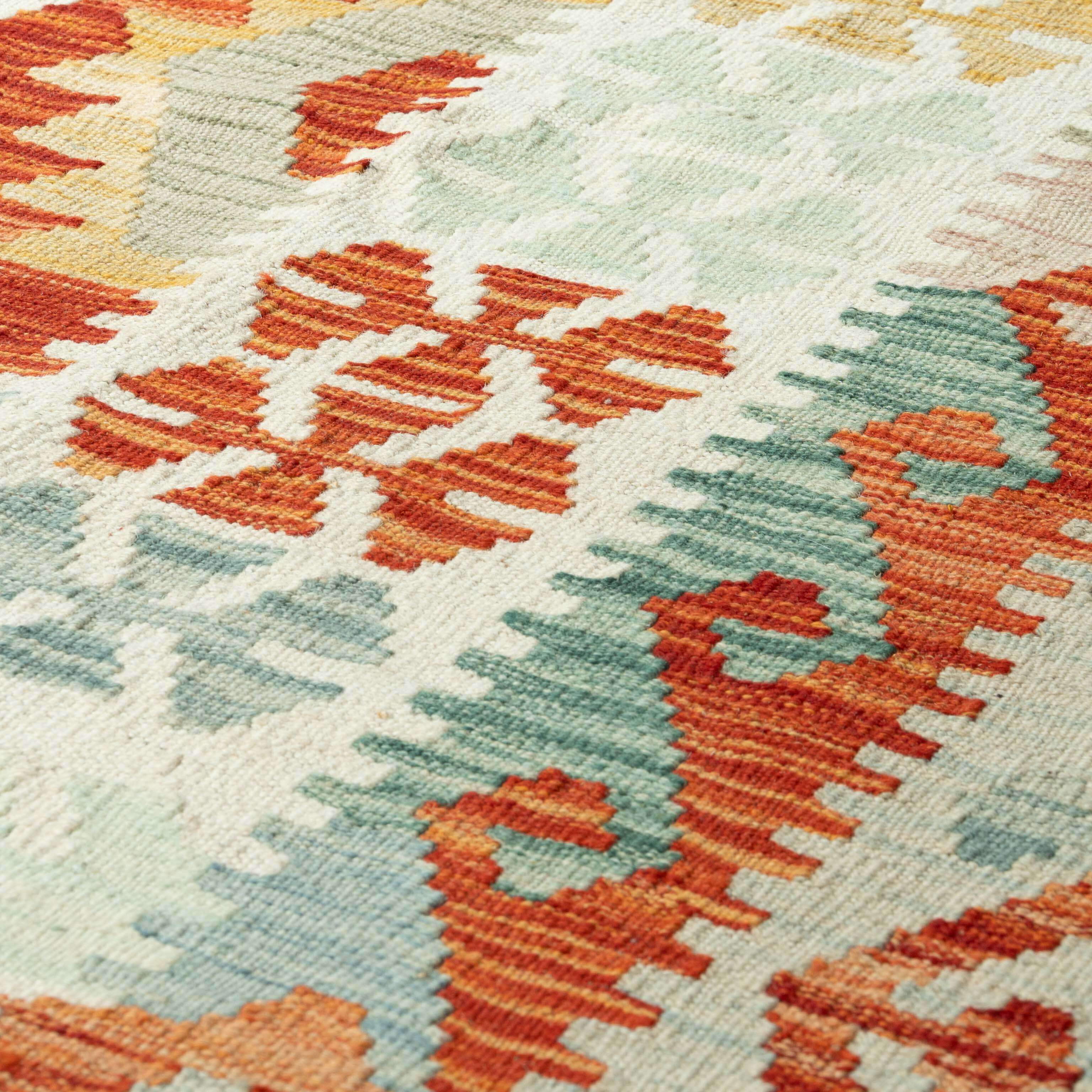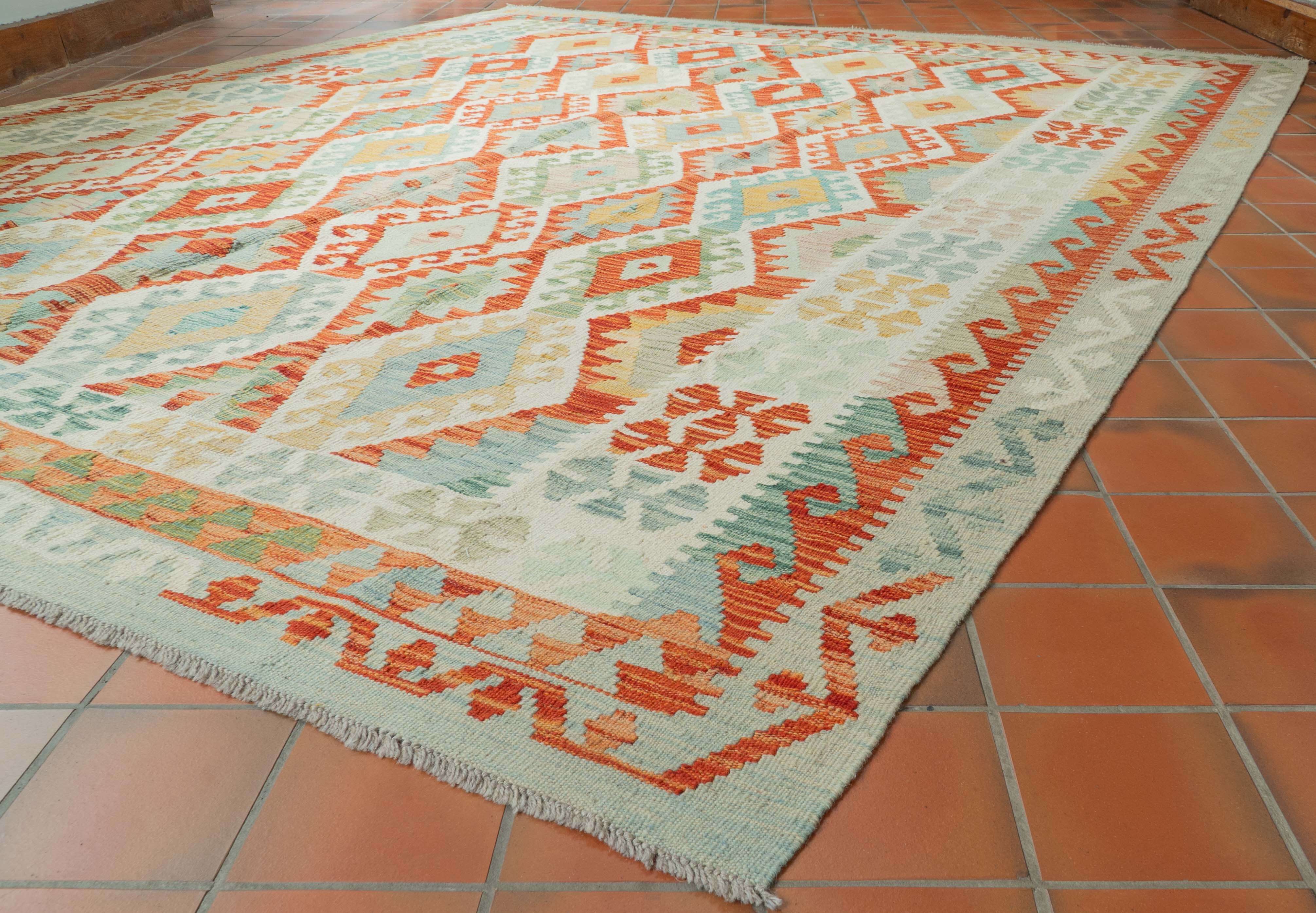 Experience the quality and tradition of Afghan craftsmanship with our handmade Kilim. This flat-weave kilim is woven from traditional, vegetable-dyed wool, making it durable and ideal for use with underfloor heating. Its colourful and striking design is reversible, allowing it to be used as a floor covering, wall hanging, or throw. Elevate your space with this stunning and affordable piece.