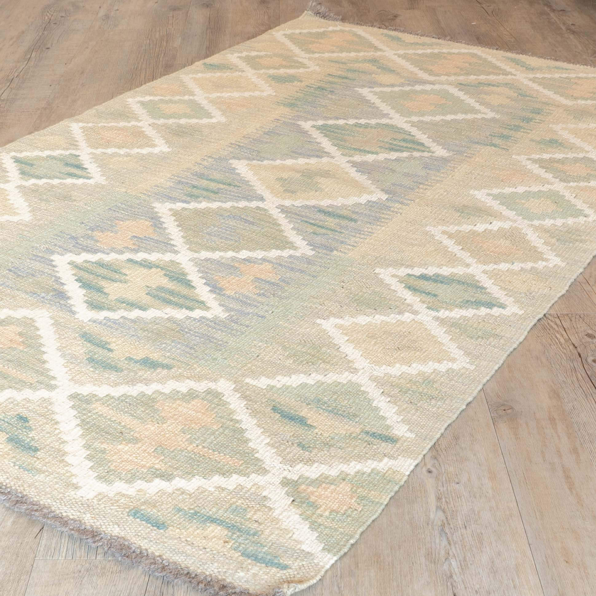 Experience the quality and tradition of Afghan craftsmanship with our handmade Kilim in very soft muted colourings. This flat-weave kilim is woven from traditional, vegetable-dyed wool, making it durable and ideal for use with underfloor heating. Its colourful and striking design is reversible, allowing it to be used as a floor covering, wall hanging, or throw. Elevate your space with this stunning and affordable piece.