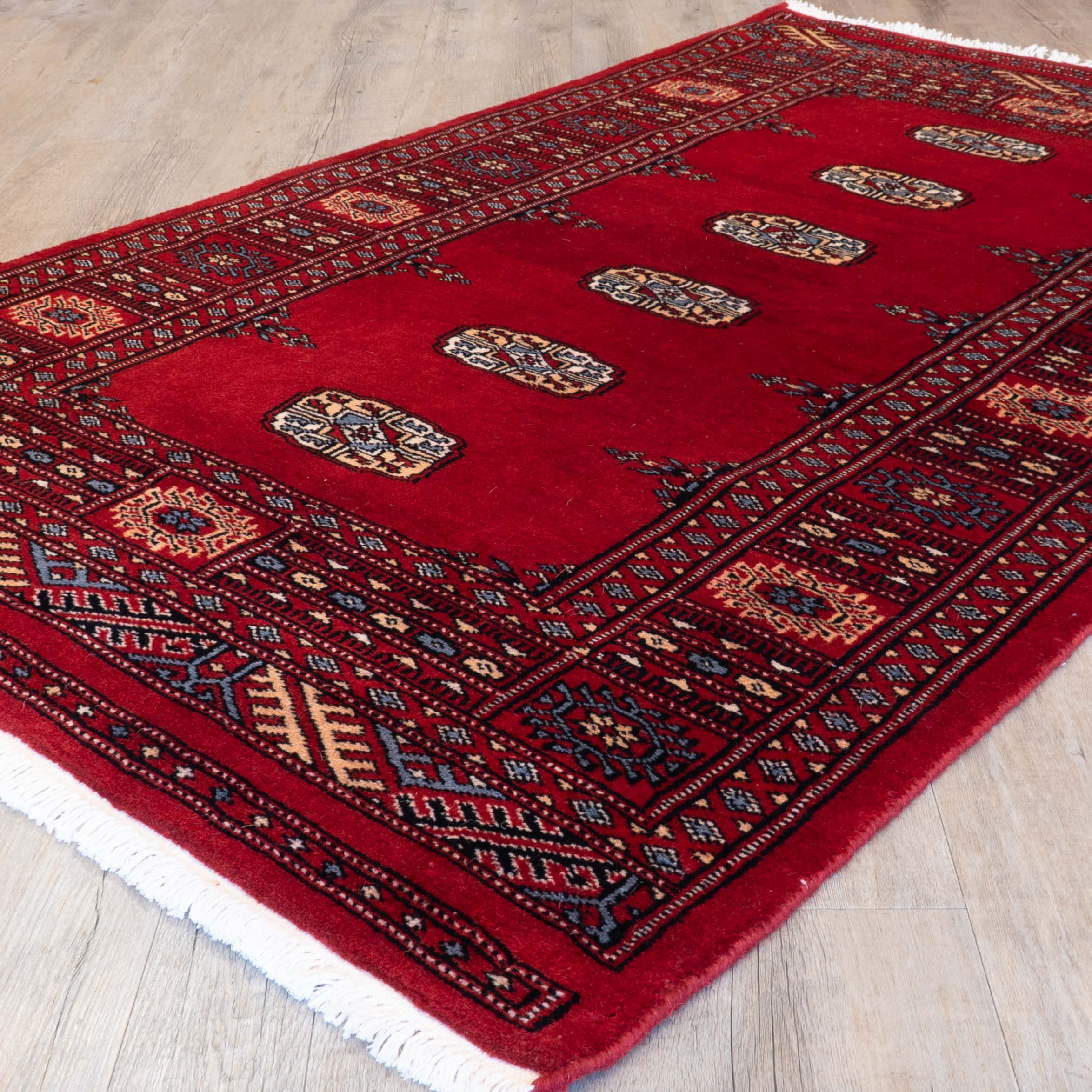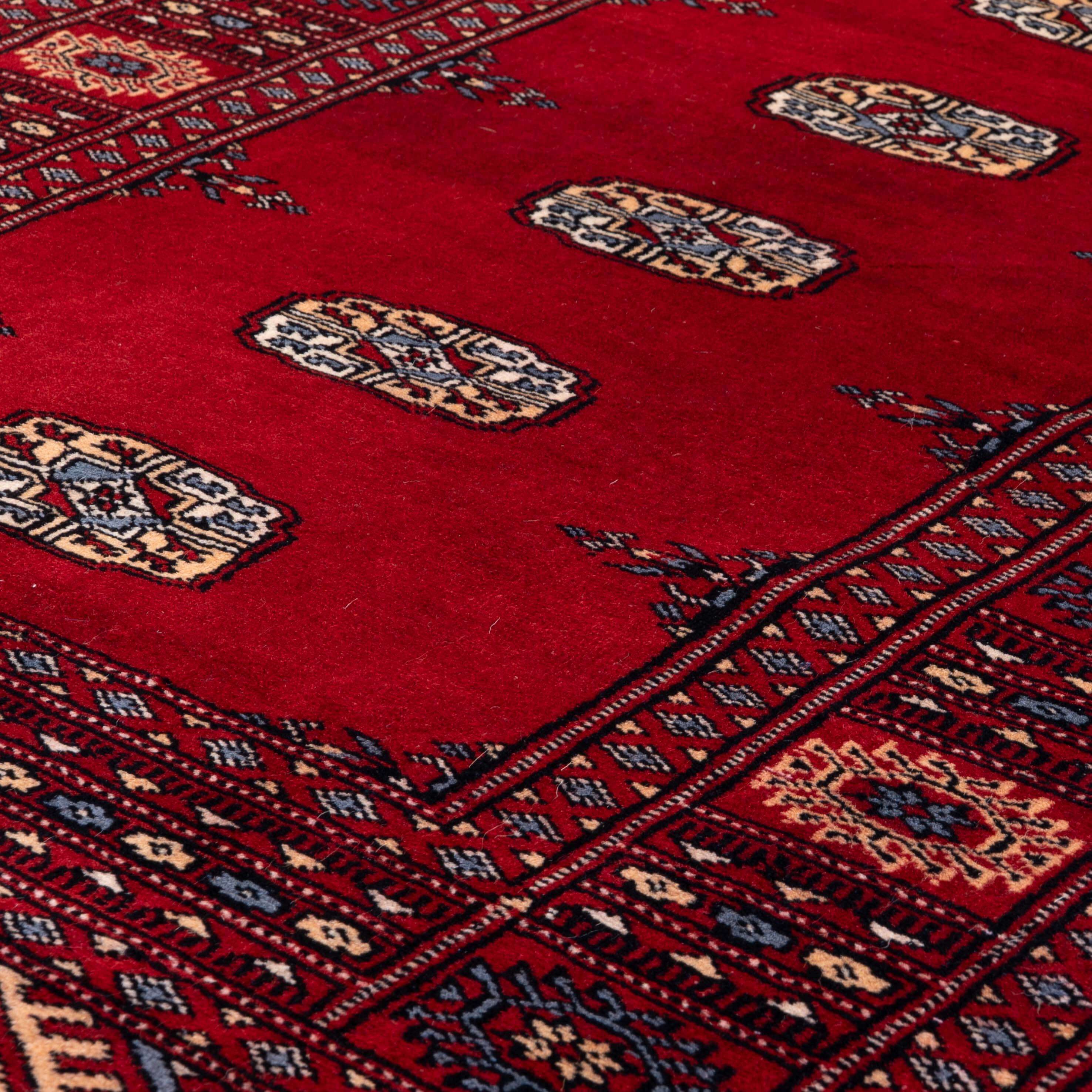 Crafted by skilled weavers in the villages surrounding Lahore, this authentic Pakistan Bokhara rug exemplifies traditional craftsmanship. The wool pile is meticulously hand-knotted onto a sturdy cotton foundation, creating a luxuriously soft, silky surface that invites barefoot comfort. Its rich red hue and intricate traditional design bring timeless elegance to any interior space. This exceptional piece offers the hallmark quality and durability of genuine handmade rugs at a remarkable value, making it an investment in both beauty and longevity.