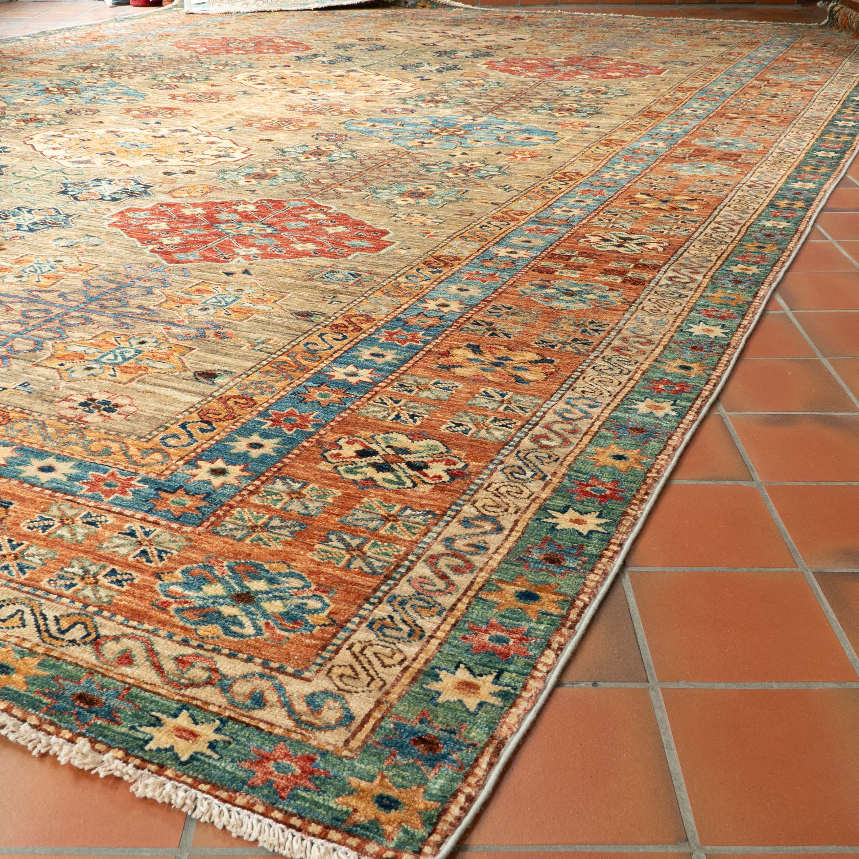 Although Kazaks are hand-knotted in Afghanistan, the design originates from the Caucasus. The short pile emphasises the pattern's sharpness. Each piece is crafted from exceptional Afghan wool, typically spun in the Ghazni region. Afghan wool is generally slightly coarser and curlier than other wools, making it perfect for carpet weaving. Afghan Kazak carpets are traditionally made with bold geometric designs in intense, vibrant colours such as rich reds, warm terracottas, and shades of blues with soft golds and creams.
