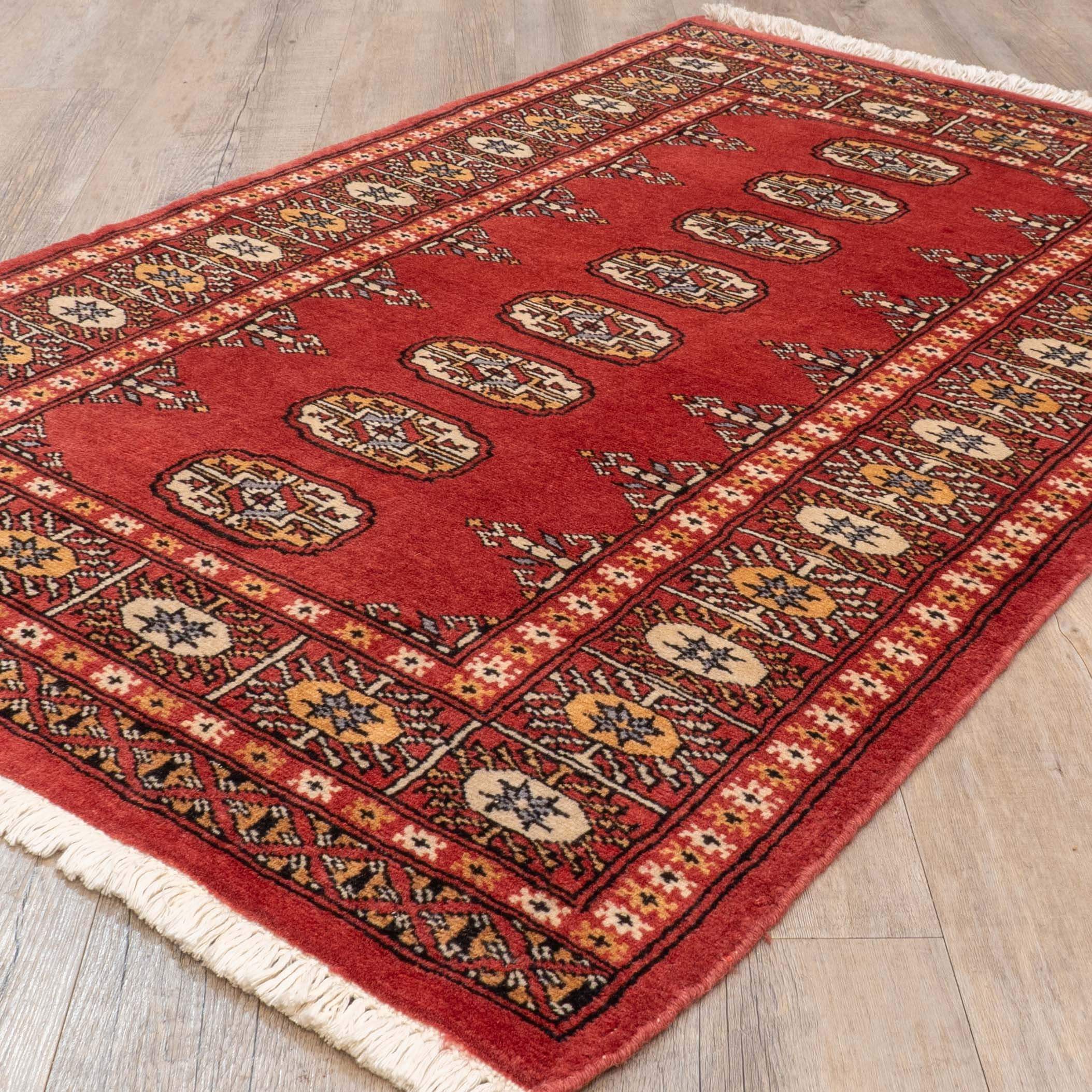 The well-known Bokhara design originated in Uzbekistan, where nomadic Turkoman tribespeople first sold their rugs. The repetitive octagonal motif, or "gul" (Persian for rose), is characteristic of Bokhara rugs, and today Pakistani people weave this design in a wide range of colours and sizes. More recently, we have seen some interesting variations- in this instance, the design has morphed into butterflies.