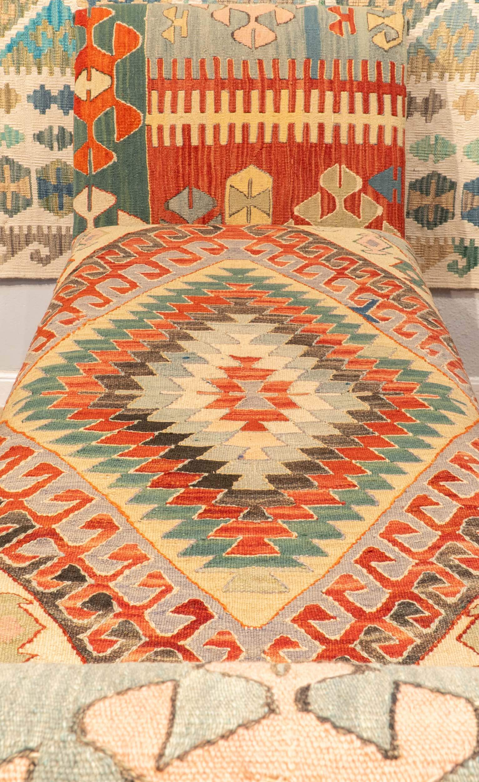 Before the Kilim is fitted to the furniture, it is bonded to a secondary fabric to prevent the open areas from exposing the fillings and to make it more secure.