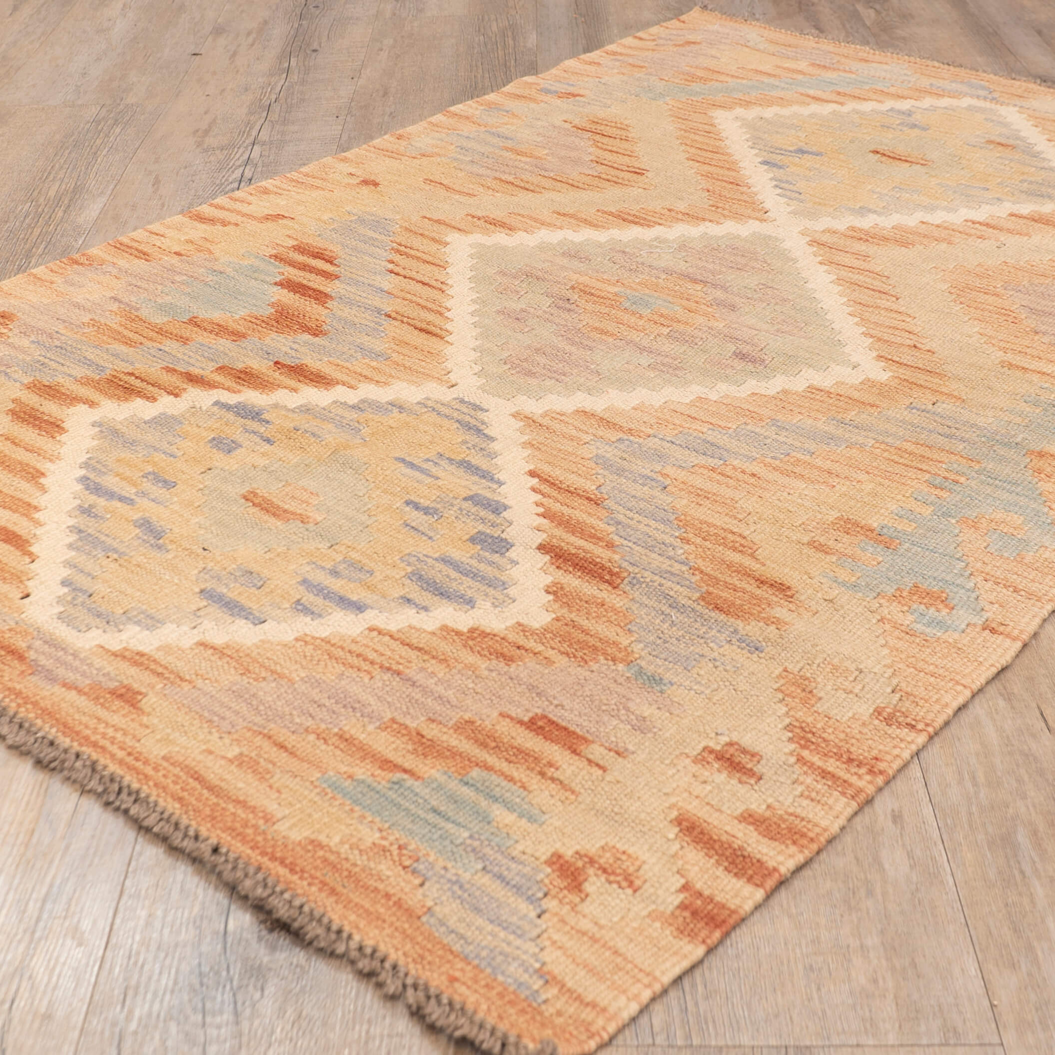 Experience the quality and tradition of Afghan craftsmanship with our handmade Kilim. This flat weave kilim is woven with traditional vegetable-dyed wool, making it durable and perfect for use with underfloor heating. Washed kilims offer a softer, more subtle look than conventional kilims and are reversible, allowing them to be used as a floor covering, wall hanging, or throw. Upgrade your space with this beautiful and inexpensive piece.
