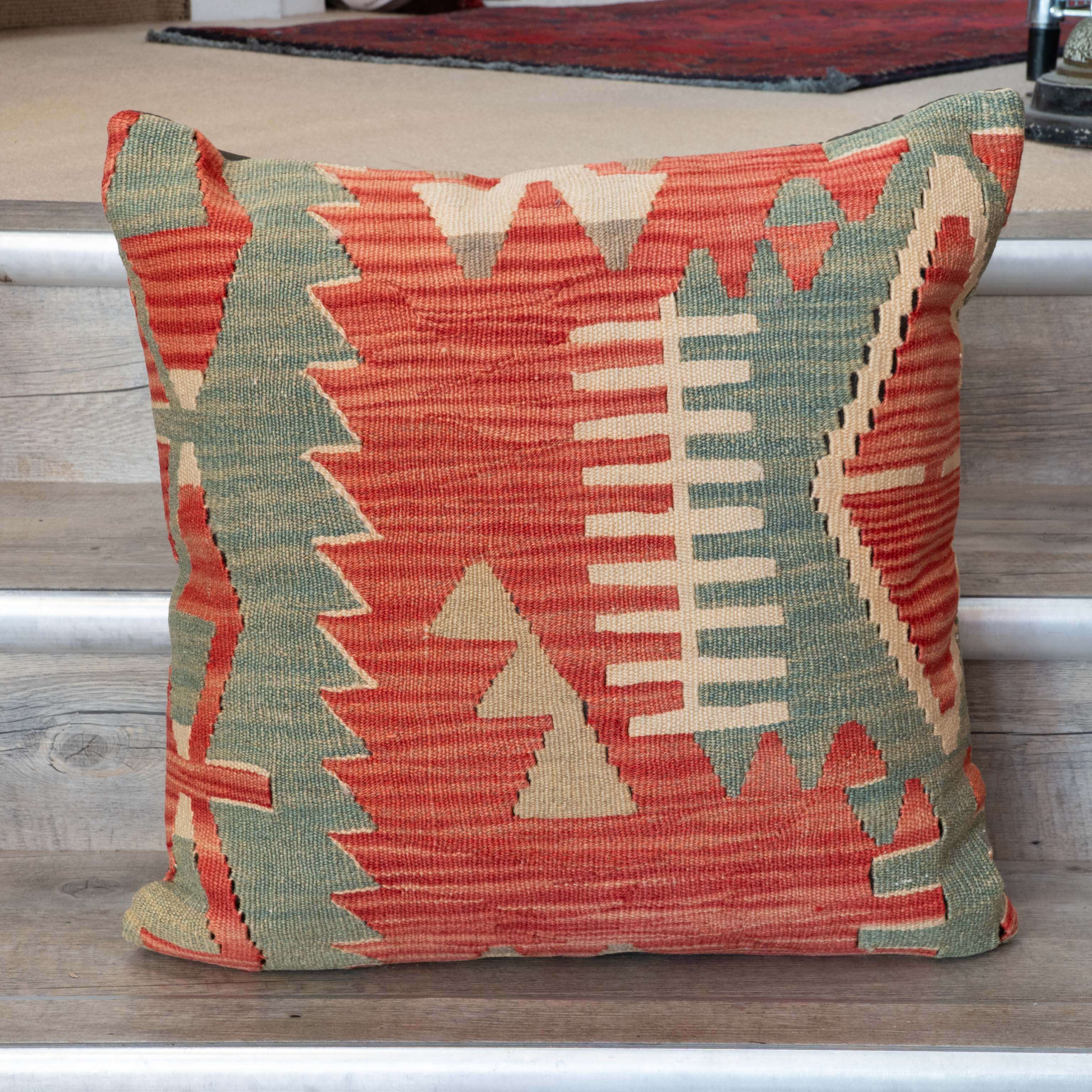 Our collection of kilim cushions offers great colours, designs and textures. The pieces are often taken from a larger old, sometimes antique kilim, cleaned and sorted to repurpose and salvage a treasured fabric that otherwise could be lost. The pattern may be cut in unusual and interesting ways to ensure as much of this precious resource can be saved. In addition, the cushions are fibre-filled, making them more suitable for individuals with allergies to feather fillings.  Product size: 50 x 50cm (20" x 20")