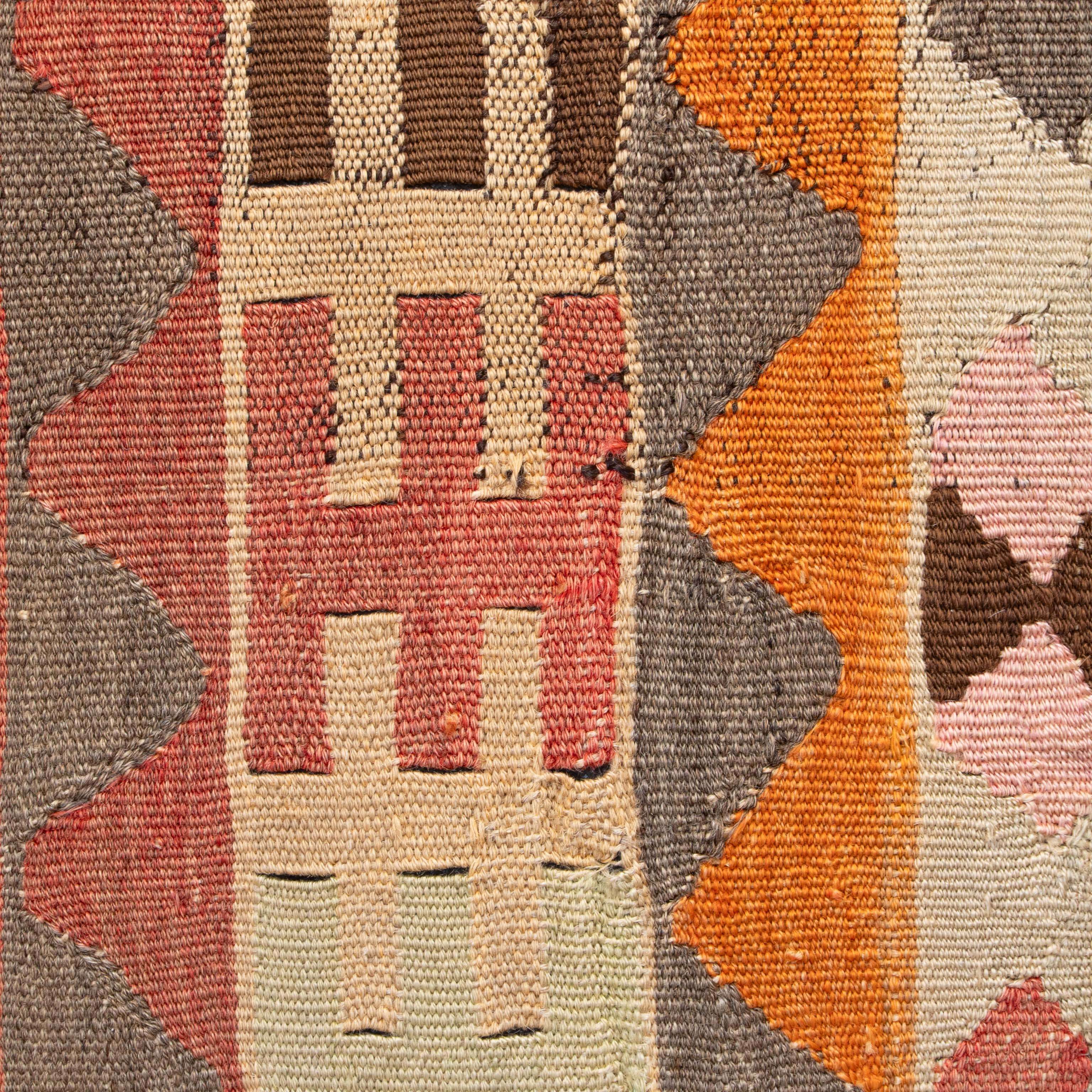 Our collection of kilim cushions offers great colours, designs and textures. The pieces are often taken from a larger old, sometimes antique kilim, cleaned and sorted to repurpose and salvage a treasured fabric that otherwise could be lost. The pattern may be cut in unusual and interesting ways to ensure as much of this precious resource can be saved. In addition, the cushions are fibre-filled, making them more suitable for individuals with allergies to feather fillings.  Product size: 50 x 50cm (20" x 20")