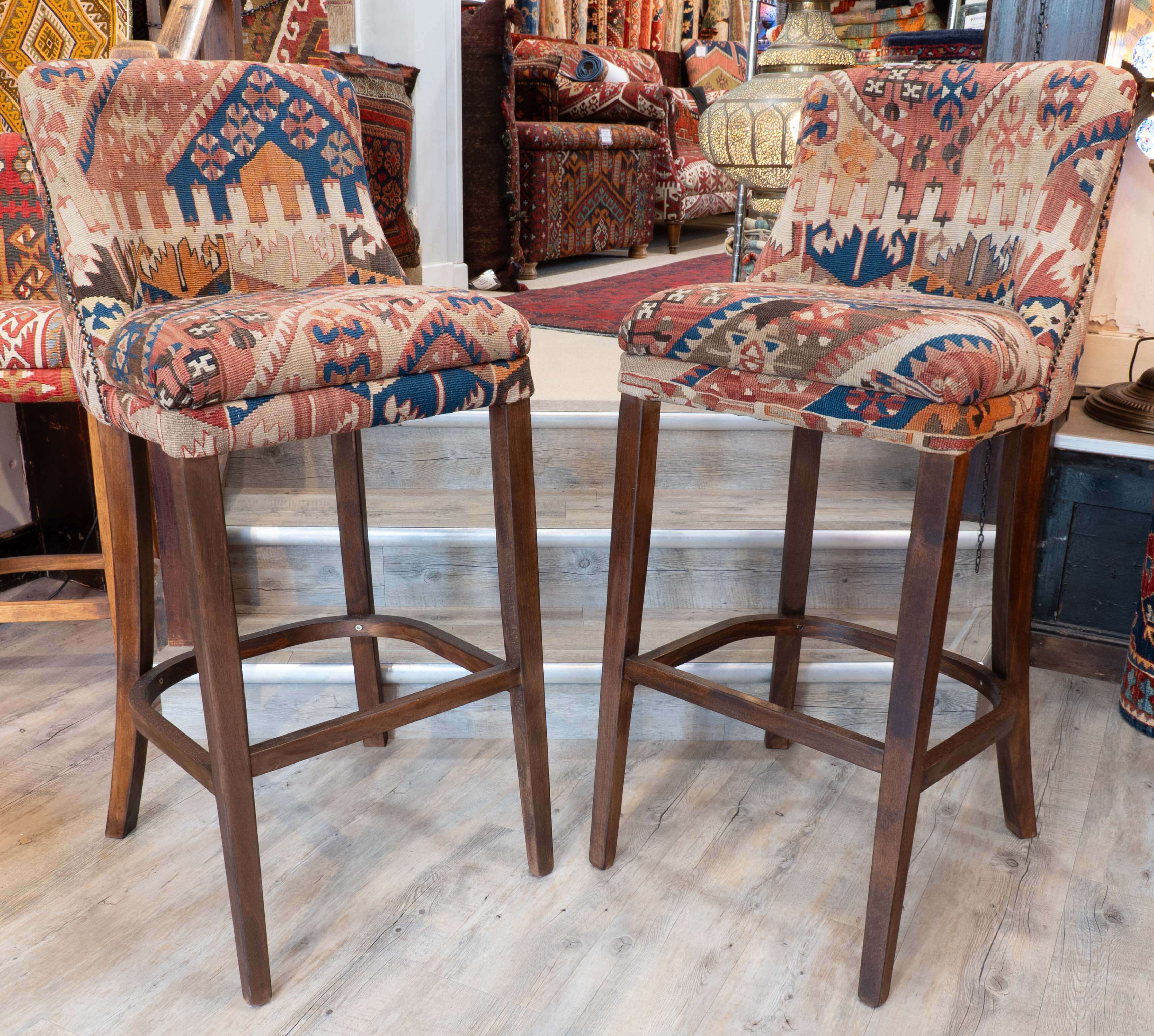 These interesting barstools are very smart. The salvaged Kilim has been repurposed into high stools, which will be a fabulous addition for anyone seeking something extra special and unique. Each piece of Kilim has been expertly placed to full effect; although we can't do multiple identical chairs, we try to get them made as 'Jack & Jill' pairs. Of course, if anyone requires more, we can cut kilims from the same piece to create a set more like a 'harlequin set'. Don't hesitate to contact us to discuss this if needed. Finally, the chairs were studded around the back, and the wood was polished with Danish wax to a medium oak.